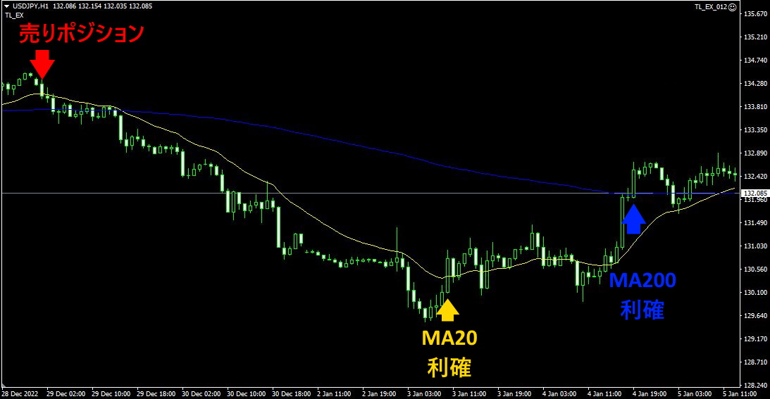 売りの場合も同様で、レートが移動平均線を上抜けしてから決済が実行されます。TOUCHをONにしておくと、移動平均線にタッチしたら決済されます。