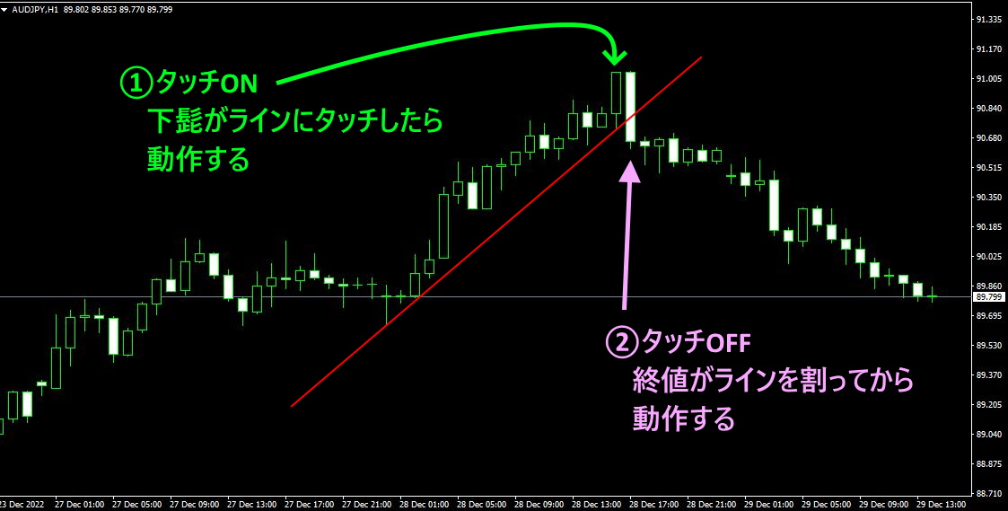タッチONの方が、約ローソク足1本分だけ早く動作しますが、確実な動作を望む場合は、タッチOFFの方が良いことがあります。デフォルト設定では、タッチOFFになっています。