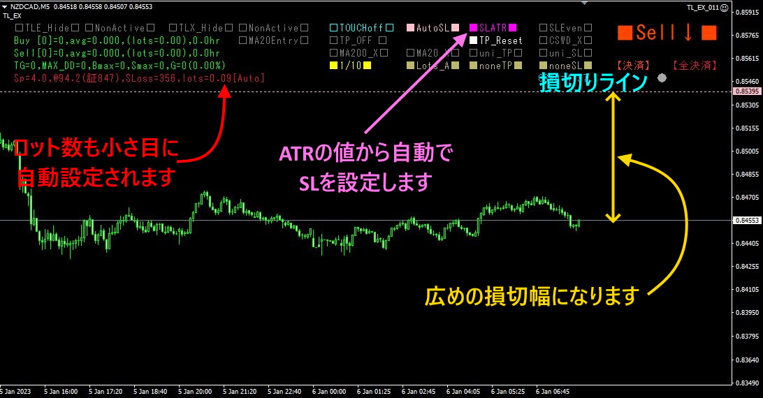 ATRは、4時間足のATR(14)を使っているので、SLATRの方が、より幅広いSL設定になります。