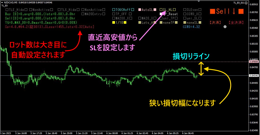EAによるポジション建てに加えて、手動でのポジション建てをした場合などで、複数ポジションを有する場合に、損切りラインを全て同じ値に設定する機能です。チャートの通貨ペアの全ポジションの損切幅を比較し、買いの場合は、それらの最大値に、売りの場合は、それらの最小値に一括設定します。