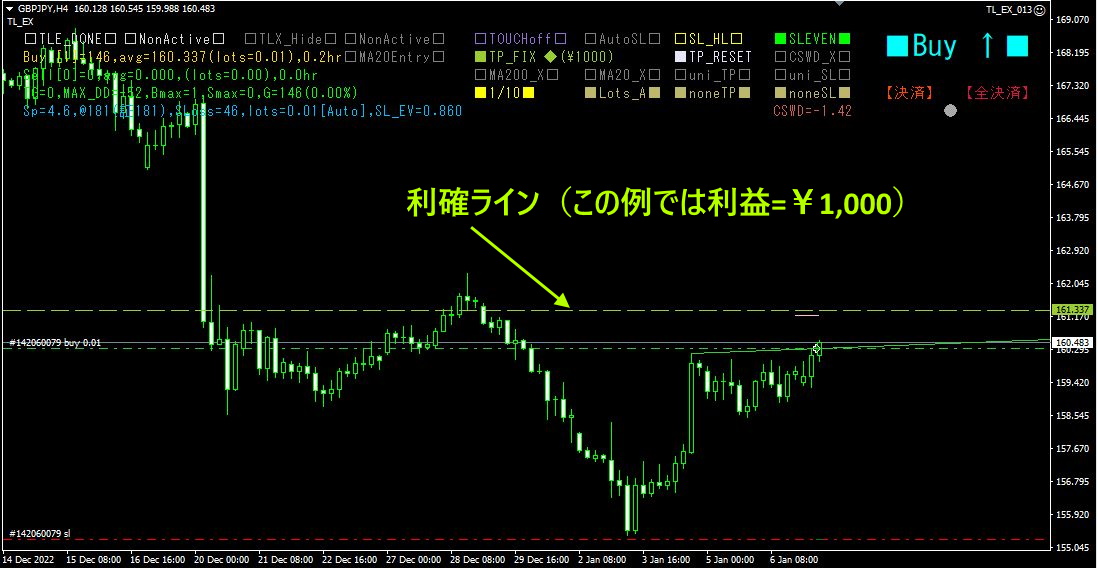 EAによるポジション建てに加えて、手動でのポジション建てをした場合などで、複数ポジションを有する場合に、利確ラインを全て同じ値に設定する機能です。チャートの通貨ペアの全ポジションのTP値を比較し、買いの場合は、それらの最大値に、売りの場合は、それらの最小値に一括設定します。