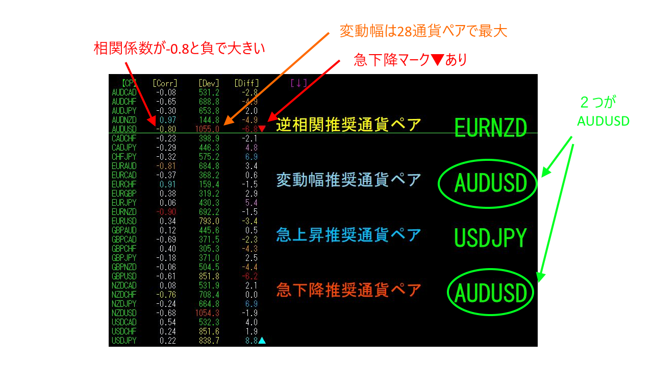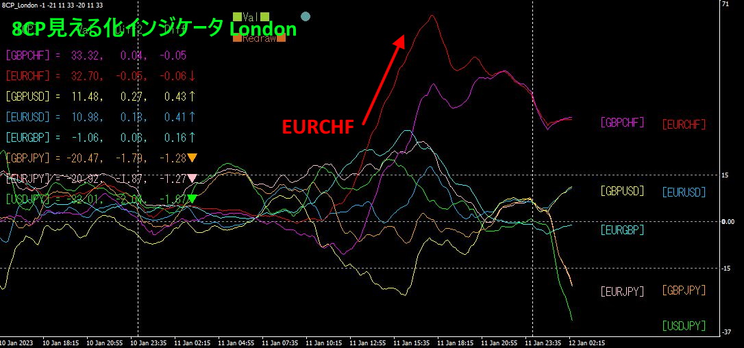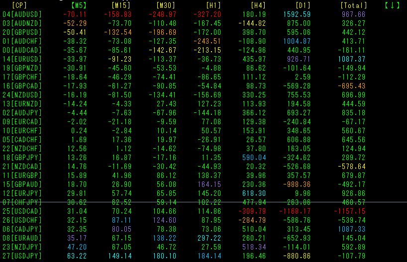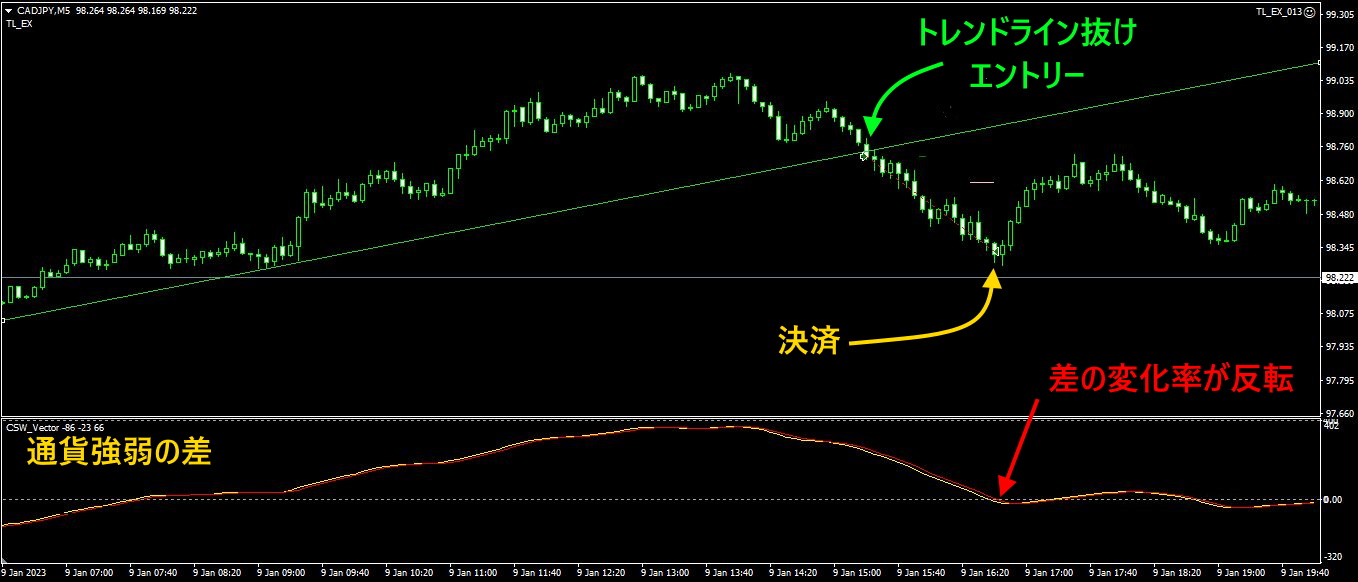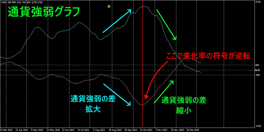 通貨強弱の差の変化率に注目して決済すれば、実際のトレードにおいて、絶妙のポイントで決済されることになります。