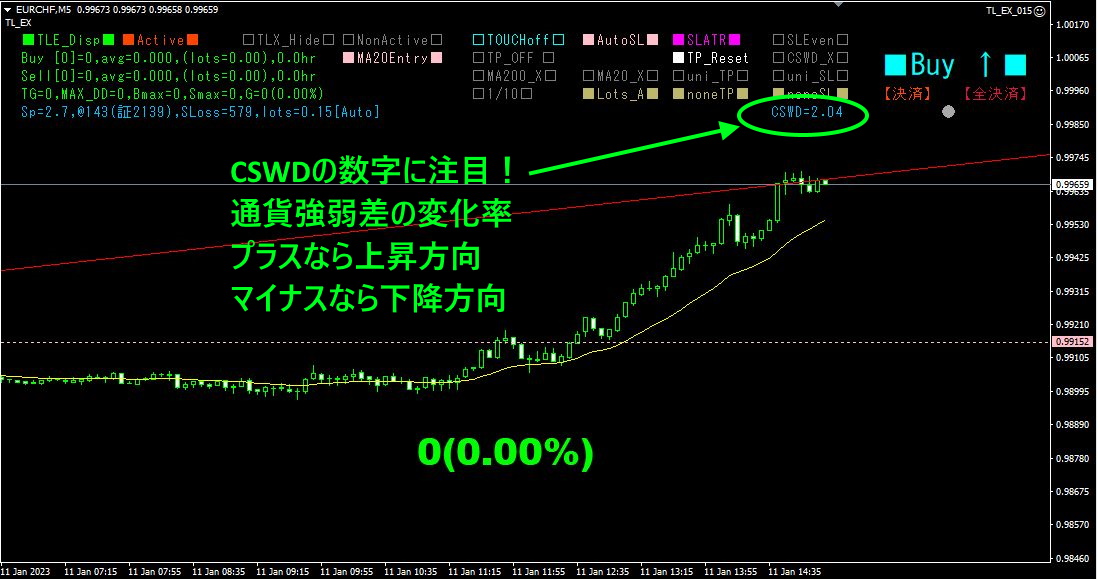 CSWDの値は、通貨強弱差の変化率の移動平均値です。FXは、この通貨強弱差に影響されるので、とても重要な指標です。