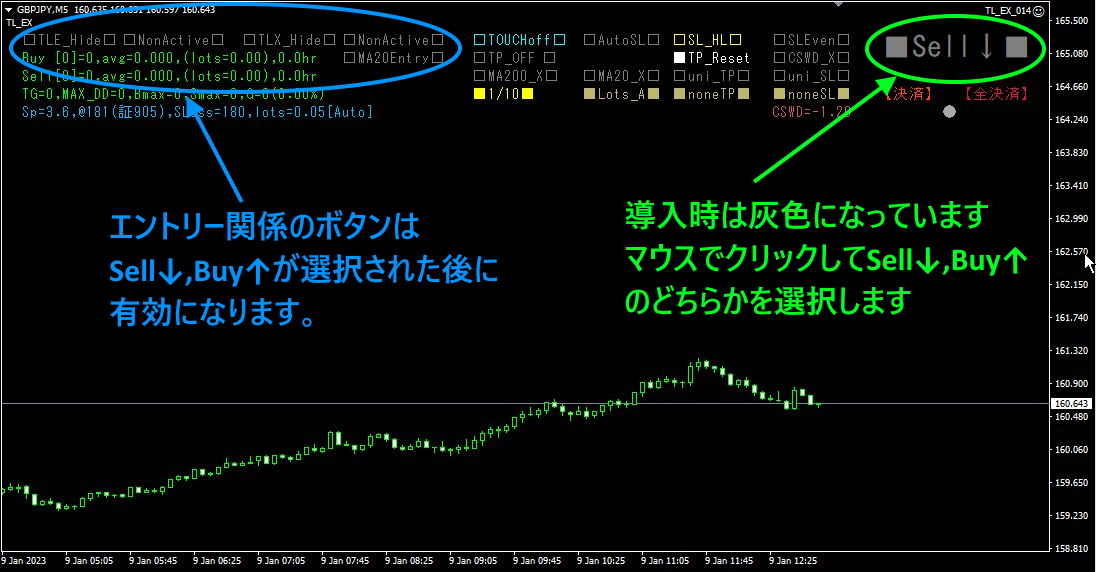 買いの場合、レートが移動平均線以下になっている場合、この機能をONにしたとたんに、買いポジションが即時決済されてしまうので、このような動作を回避するため、レートが移動平均線を上回るまでONにできないような安全対策を施しています。売りの場合も同様で、レートが移動平均線よりも上の場合は、この機能をONにできません。