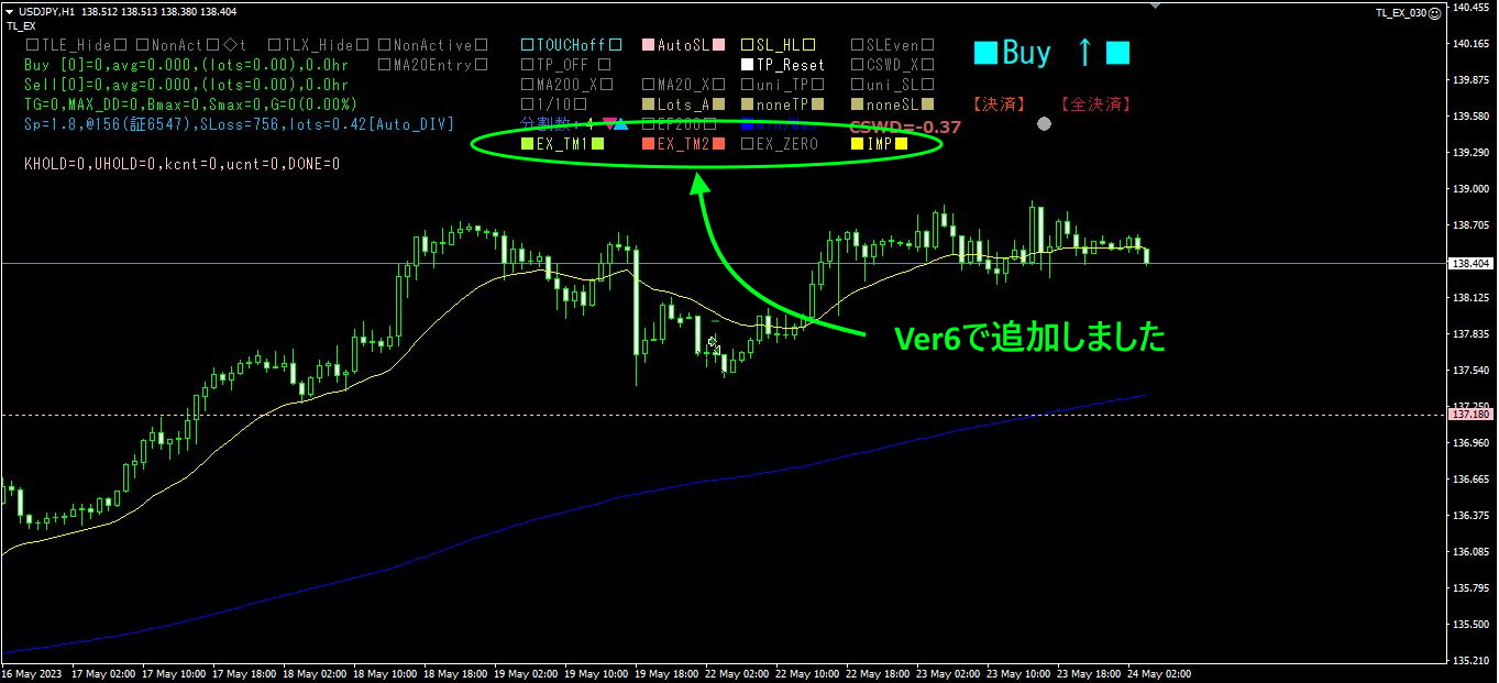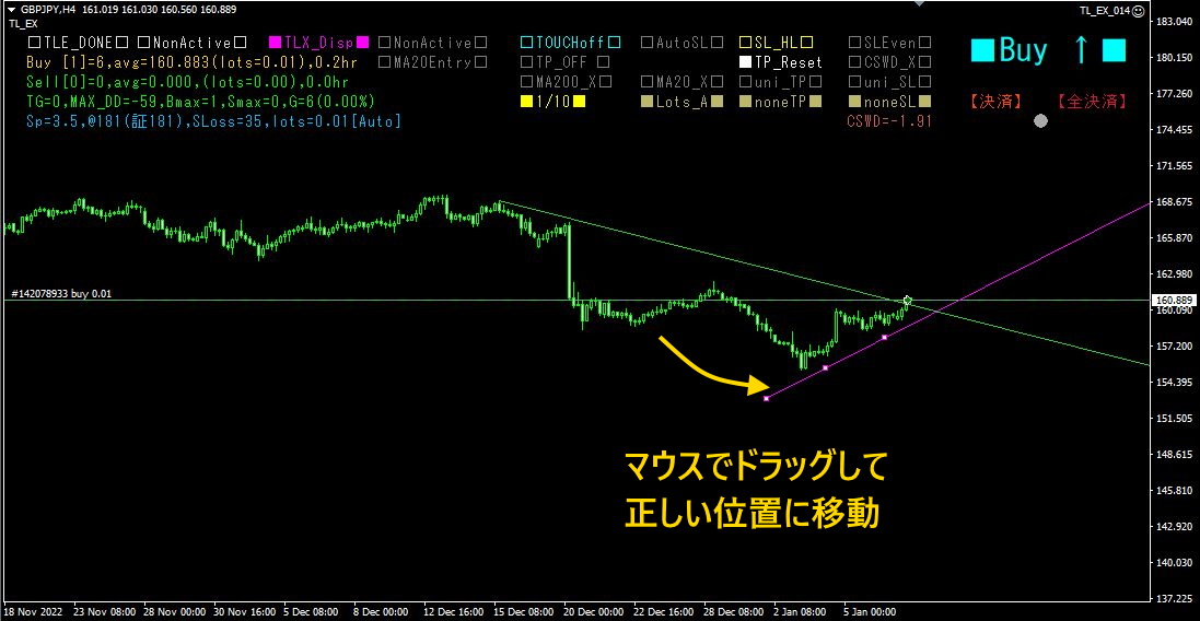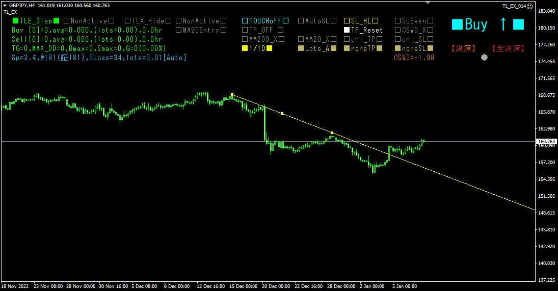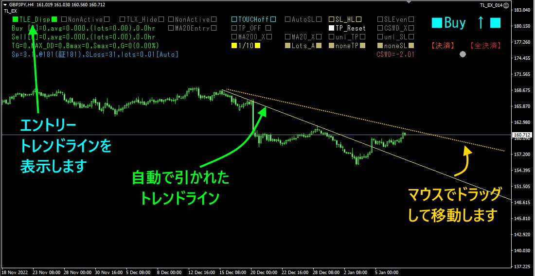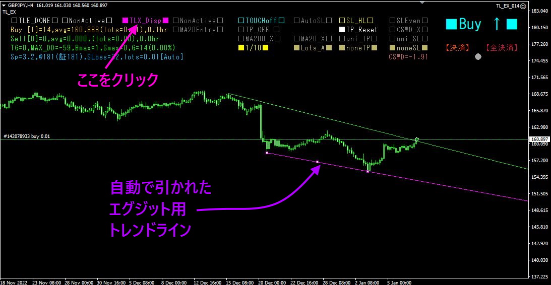 左上にある □TLE_Hide□ をマウスでクリックすると、表示が■TLE_Disp■ にかわり、自動でトレンドラインを引いてくれます。