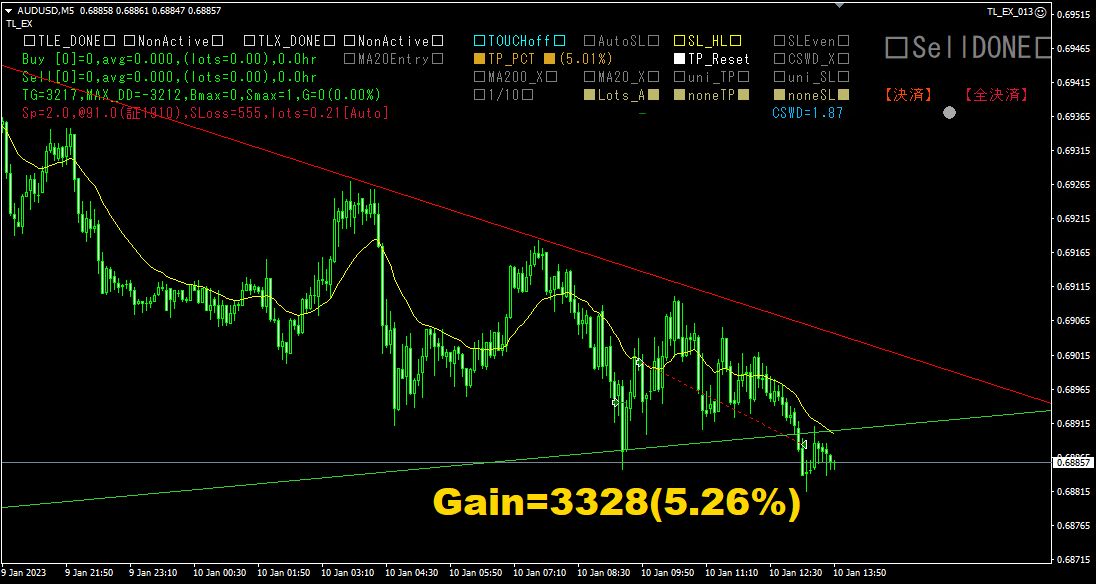 下降トレンドラインを上抜けしたらエントリー、上昇トレンドラインを割り込んだら決済というシングル動作を自動で行う半自動EAです。特筆すべきは、「通貨強弱の差」による決済機能をEAに取り込んだ所です。その他にも使ってみて便利な機能を、あれもこれもと満載しました。放置型の半自動トレードが楽に行える優れたツールとなっています。