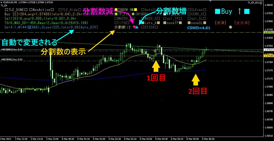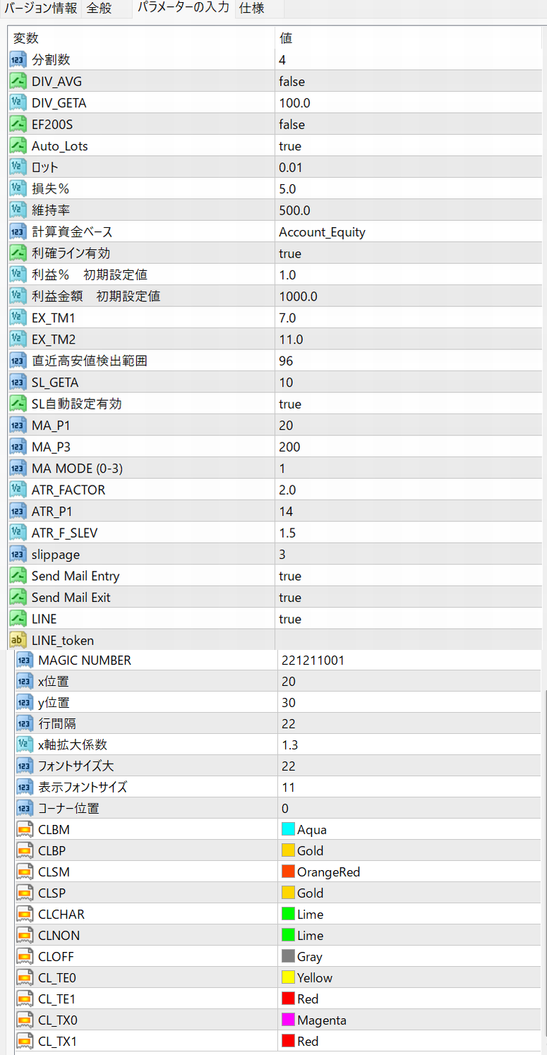 今現在走っているEAのパラメータを変えたいという場合でも、現在の保有ポジションはそのままで、最大分割の設定値を変更したりなども出来るようになっています。
