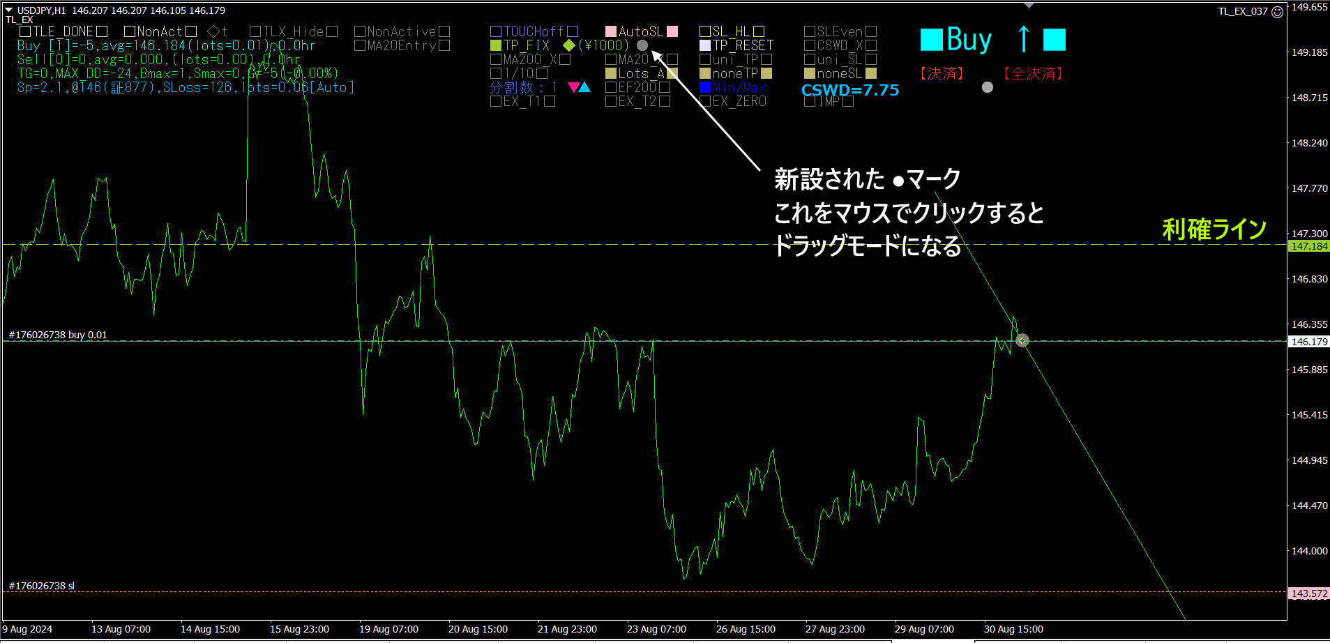 ●マークをクリックすると、ドラッグモードになり、利確ラインをマウスで自由に移動できるようになります。