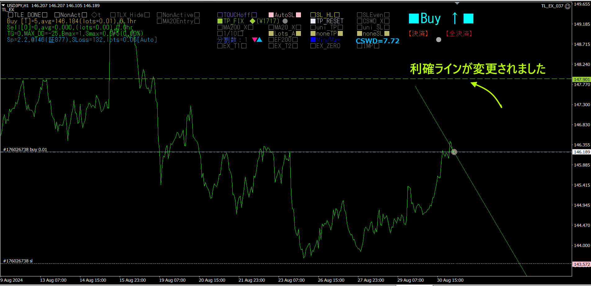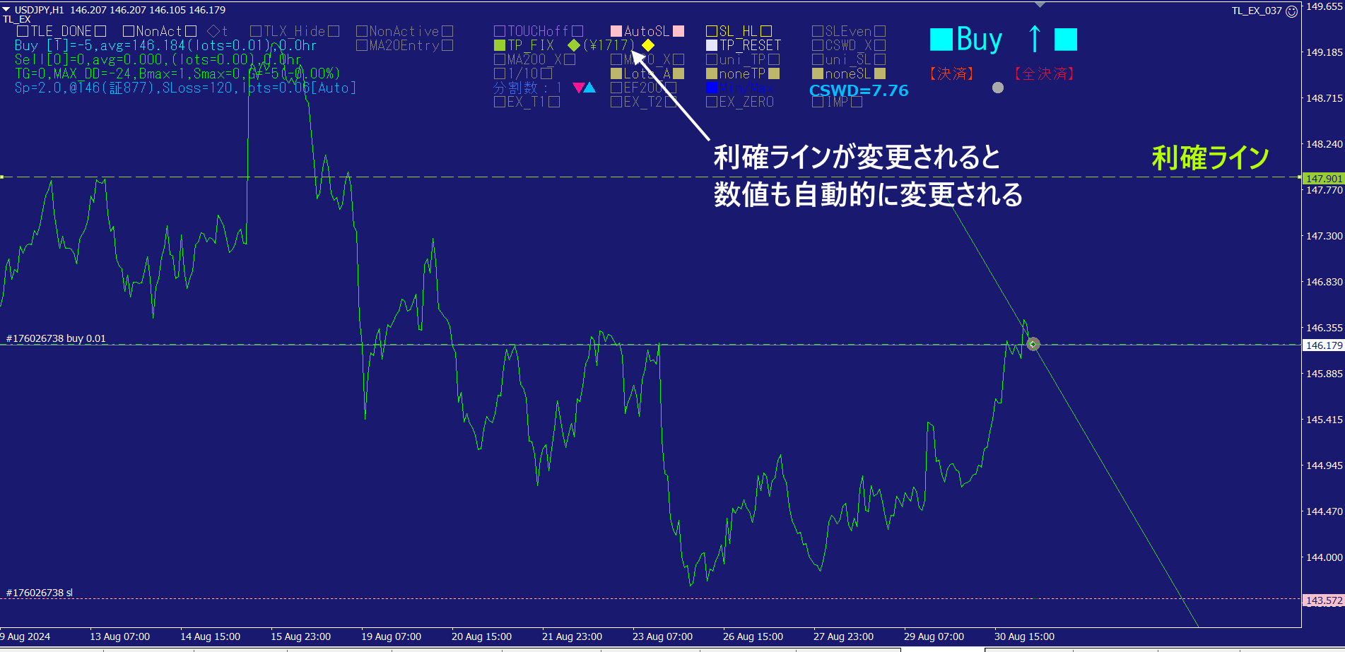 利確ラインをマウスでドラッグすると、利確設定値が変えられます。