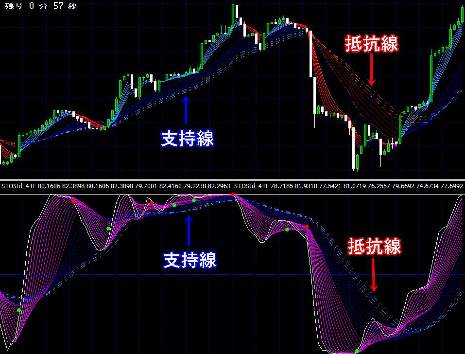 インジケーターのピンクの帯が支持線・抵抗線とは反対方向に