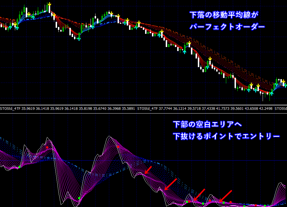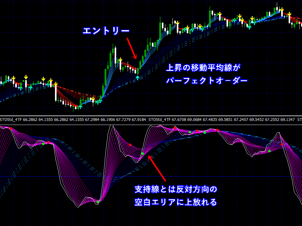 はじめは、勝率を安定させるには、移動平均線の支持線とインジケーターの支持線の両方を概ね同時に抜けていくポイントに