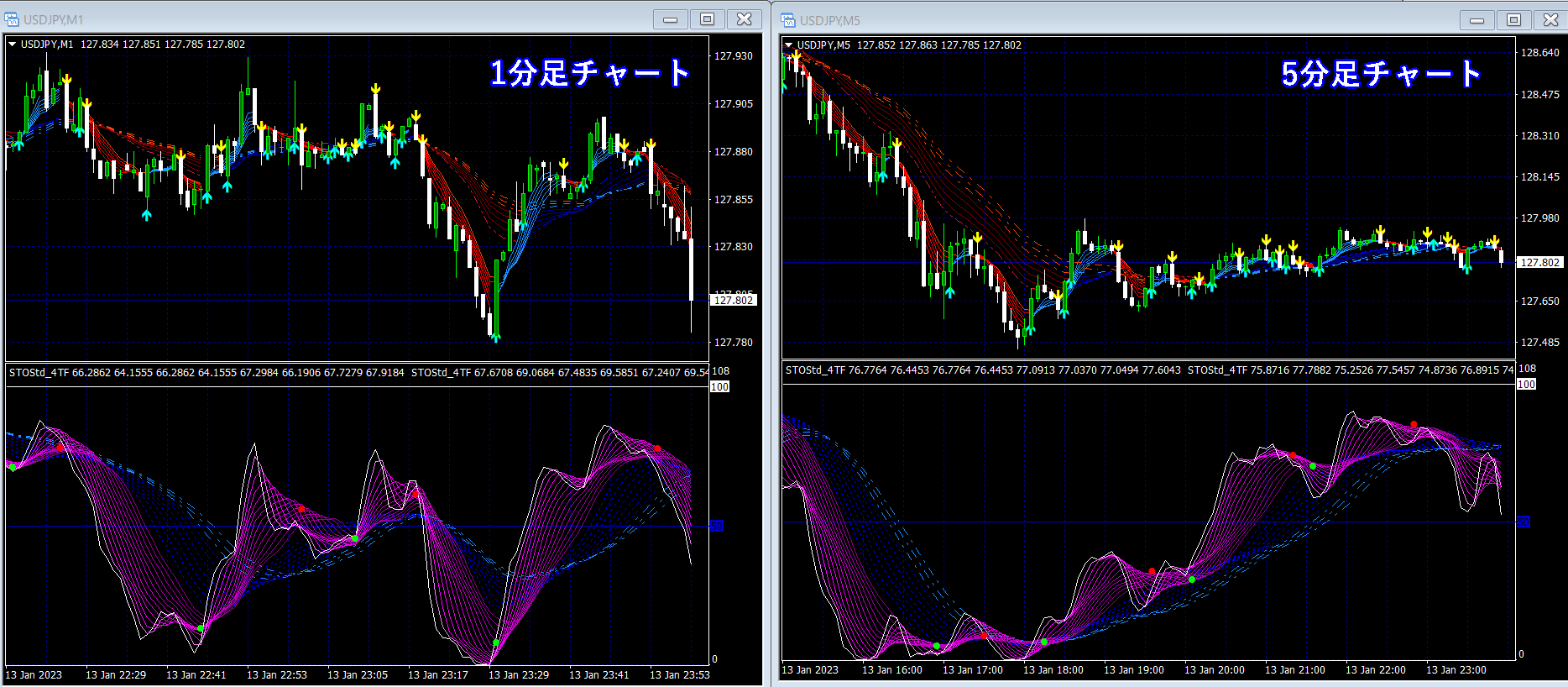 USDJPYの同じ時間帯(2023/01/13)のチャートを全ての時間足で公開します。