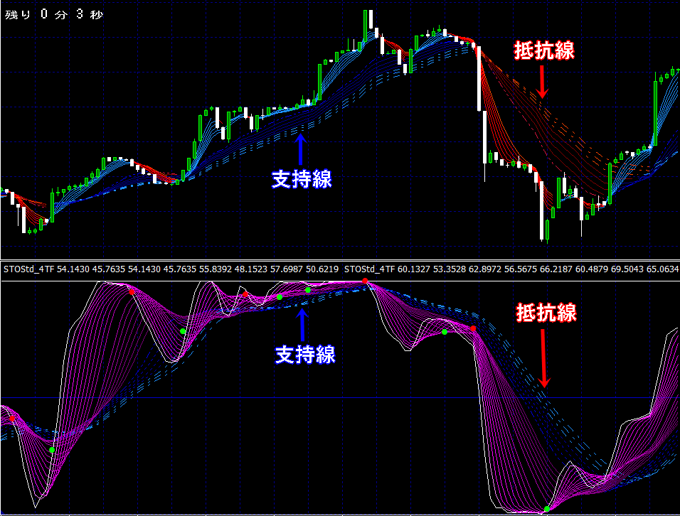 支持線・抵抗線とは反対の方向にインジケーターのピンクの帯が