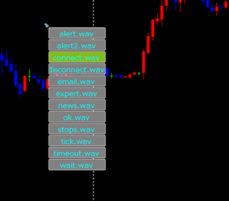 《使い方》 通常のインジケータと同様にセットしてください。 パラメータ画面で音源の繰り返し回数、間隔(m秒)を指定します。 その後は画面に表示されたボタンで音色を確認します。 ボタンの表示文字は MT4に格納されている音源のファイル名です。 確認が終わればインジケータを削除してください。