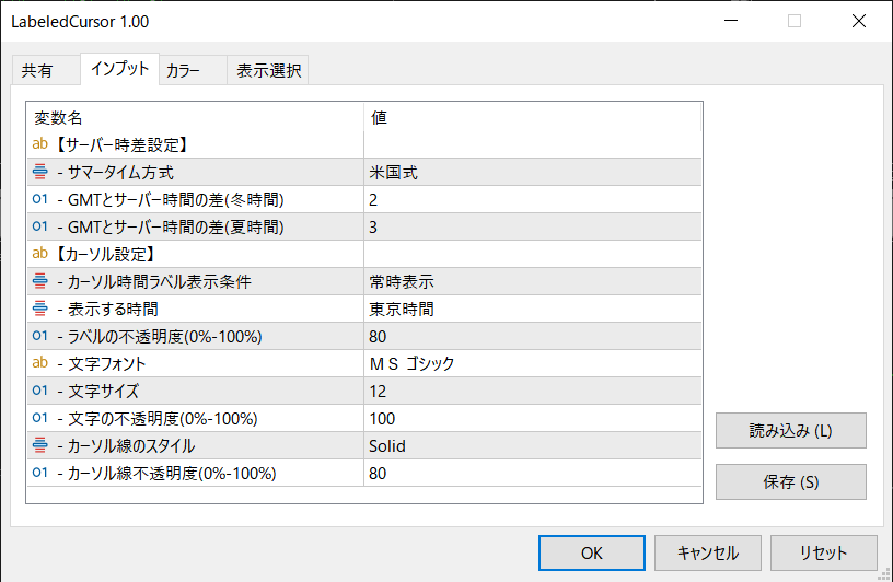 | 表示する時間 | カーソル位置の時間をどの都市にあわせて表示するか選択します。 ニューヨークの取引時間(EST+7)/東京時間/ロンドン時間/ニューヨーク時間/シドニー時間 |