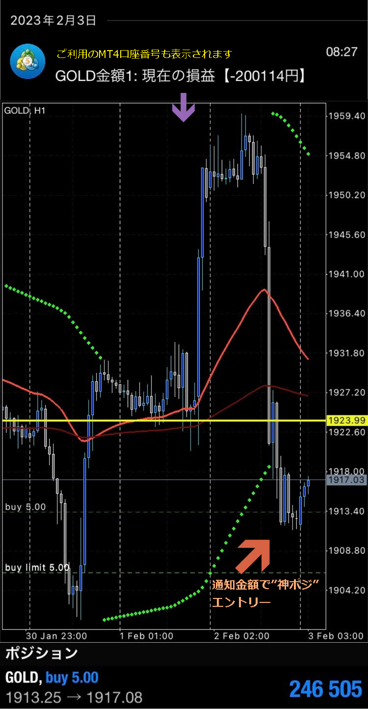・GOLDのチャートに起動した場合は、チャート数は関係なく同一口座内の「GOLD全体の合計損益(金額)を通知」します。