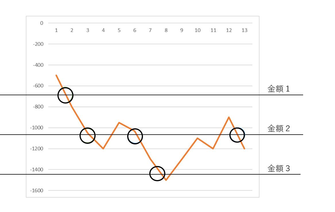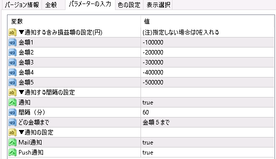 ・金額1~金額5まで「+ or -」で合計損益(金額)を指定すると、下記のタイミングで通知が届きます。