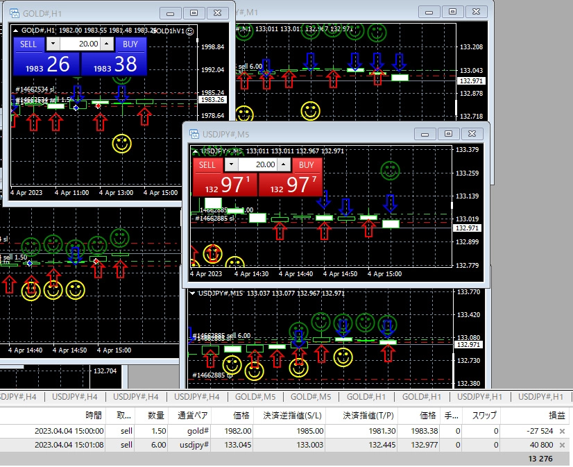 ★合計168個のサインツールセット!★ ・チャンスはニコちゃんマークと矢印が出た時になります。緑色は下、黄色は上となります。このサインツールはその時の強さが矢印表示となります。例:ニコちゃんマークと上矢印が連続で出ている場合は上昇相場と判断できます。 ドル円、ポンド円、ユロ円、ユロドル、、AUDJPY/CADJPY/NZDJPY、24種類×7個のSTセットサインツールになります。 24種類のサインツールになります。 スキャルピングからデイトレ対応しております。 このサインツールは普通のサインツールと違い 「現在の強さが出るサインツール」であり 矢印方向にエントリーすればOK仕様となっております。 MT4のみ対応しております。