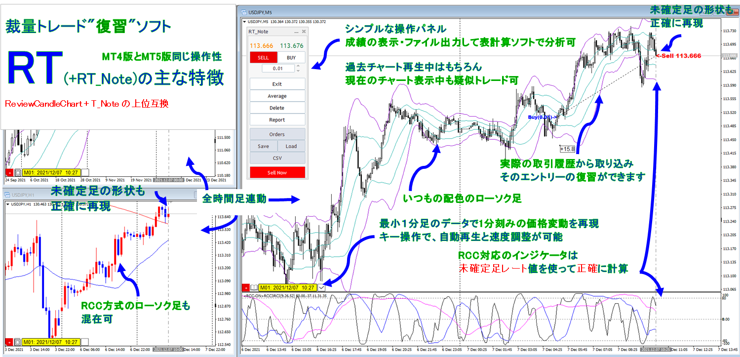 RCC同様、マルチタイムフレームは無論のこと、異なる通貨ペアとの同期にも対応しています。 実際のトレード(デモ口座・リアル口座)履歴を取り込んで、トレードの振り返り、そして、検証を、すぐに始められます。 RCCで弱点と思われている「ローソクが単色で、普段のチャート設定で振り返れない」問題 基準時刻以降のチャートを隠す「オーバーラップ方式」を追加し、解決しました。お好みにより、ローソク足の表示方式を「RCC方式(過去チャートから描く方式)」と「オーバーラップ方式(隠す方式)」から、 お選びいただけます。(※チャート毎の設定で、混在可能です。) 純正品ですので、RCC対応のインジケータとの親和性はレベル高です。 RCC対応のインジケータは未確定足では表示されているレートを元に正確に計算し表示します