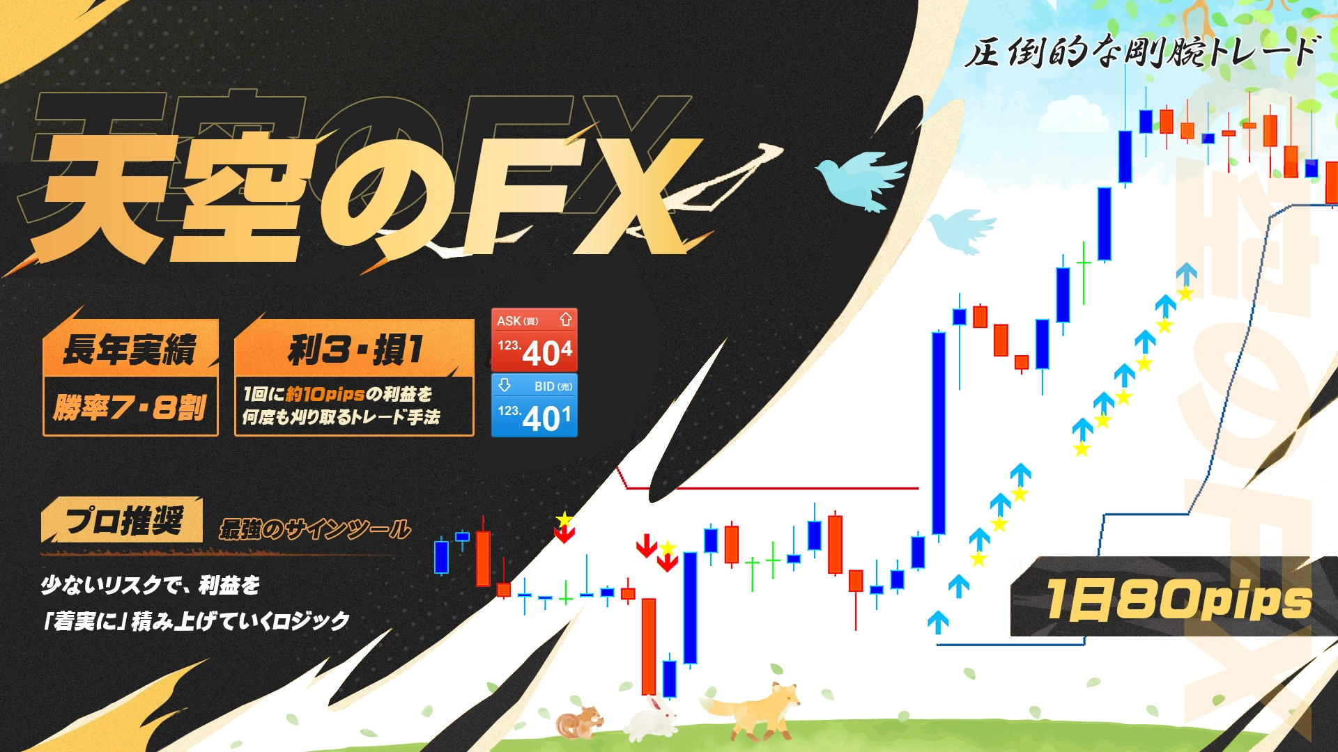「天空のFX」のメリットは、 為替の流れに沿って、何度も利益を獲得すること。 また、勢いに乗るのでエントリー後、すぐに含み益が出てくることが多く、 気持ちも落ち着いてトレードできます。 1日の流れとして、トレードは数時間を確保するのがお勧めです。 1時間に数回~程度のチャンスにエントリーをしながら、1回に+10pipsや+20pips程度を積み上げていきます。 まずは、1万通貨程度からトレードをしながら、1日80pipsを目標に続けてください。 FXは基本的に利益と損失が1:1ではないため「勝率」はそこまで重要ではありません。 しかし、このロジックを利用してエントリーポイントを絞ることで、勝てる場面でトレードができます。 また、利確や損切りも決まっているため、 7・8割程度の勝率を目標にすることも可能なのです。 なぜなら、チャンスのない場面やレンジのような曖昧な場面ではントリーしないからです。 エントリーしないレンジ相場の見分け方を、しっかりとお伝えしているからこそ、初心者でも安定したトレードが可能になります。 もちろん、勝率100%は無理ですので、いかにエントリー後は含み益の状態で利確を続けて、損切りを堅実にするかがポイントです。 しっかりと勝てる場面をロジックで選択しながら、1日を通して利益を増やすことを目指しましょう。 「天空のFX」で使用するサインツールは、最高性能なロジックを元に開発しています。 1つのインジケーターで完結するロジックではなく、4つの別インジケーターを読み込み、主となるインジケーターで分析して、矢印のサインを発生します。 これにより相場を正確に分析して、進む方向へ的確に表示させます。結果的に、ポジションを持った後にもプラスに進みやすく、利益を伸ばしやすくなるのです。 FXトレードを兼業とするりゅうと申します。 トレーダーになり18年以上が経過しました。 トレードにおいて、大事なことは明確なトレードルールを構築することです。 あなたは綺麗に勝とうとしていませんか? トレードは結局のところは確率の世界です。 リスク対リワード=1対1であれば勝率50%を超えれば破産しづらくなります。 1対2ならば勝率40%でも利益は残ります。 リスクを限定させて利益を伸ばし、毎回一定のpipsを得ることが大切になってきます。 安定して1日に100pips獲得することができれば、あとはロットを上げるだけで専業になれます。 pipsを多く獲得することにこだわる必要なんてありません。 内容にこだわらず、勝ちにこだわりましょう。 常勝トレーダーたちは決して勝ち続けているわけではございません。 泥臭く負けが続いても、トータルで勝ちにいくのです。