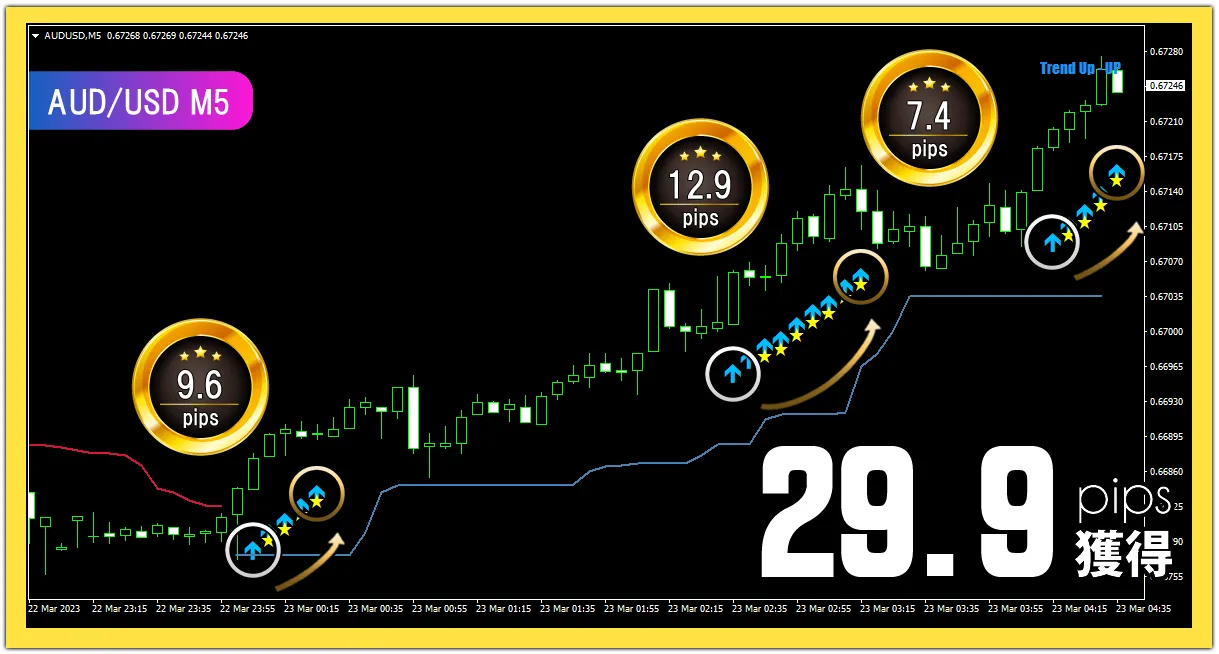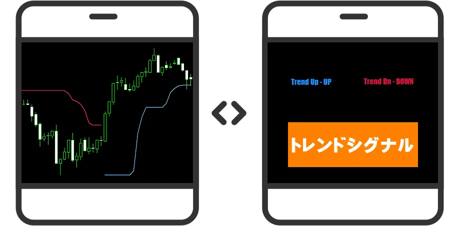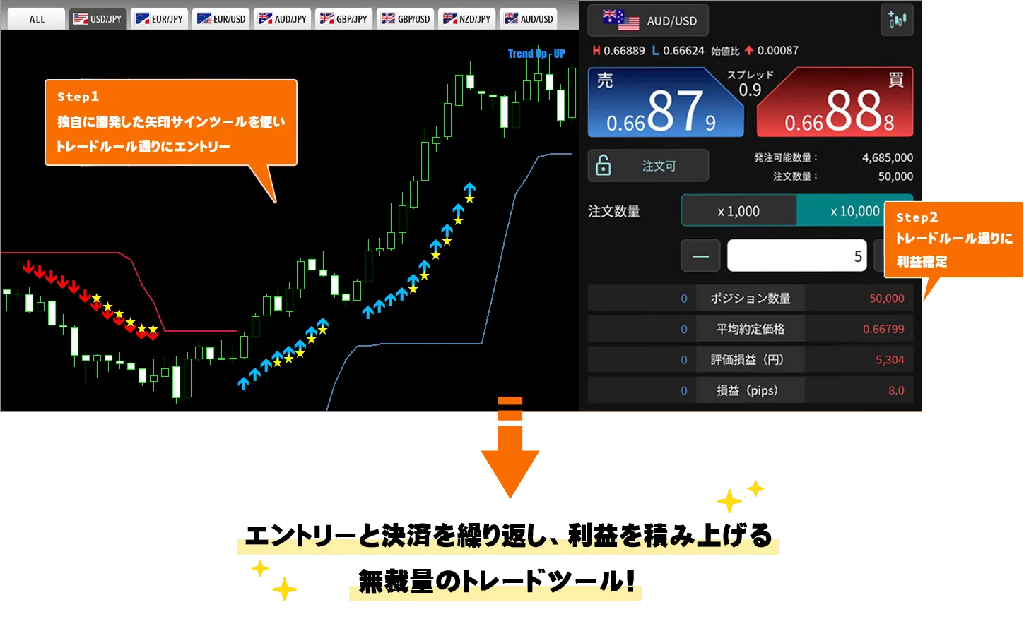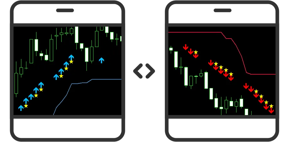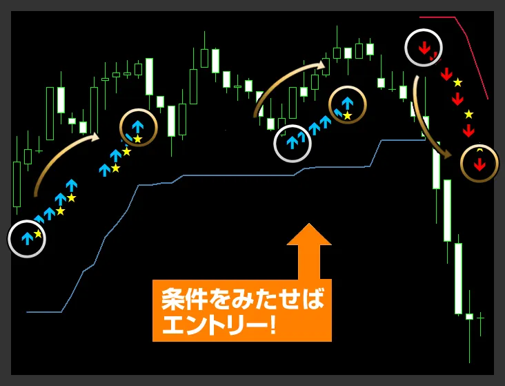 エントリーの中核となるのが矢印型のサインツールです。 順張り仕様でトレンドの初動や押し目や戻りを狙って、サインが連続して出現していきます。 一度表示されればリペイントもありませんし、アラート機能もあるため矢印の発生を見逃しません。 計算されたコード設計に基づいて、独自に仕上げているため、精度の高さに驚かれるかもしれません。 矢印サインツール以外にも★型のサインも発生します。これはトレンドの強さを測定する分析ツールです。 決済は、各種インジケーターを使用したトレールールにより明確に利確ができます。 更に、メインチャートに表示される青色と赤色の分析線はトレンドを的確に判断します。 また、トレンドのシグナル表示もあり、トレードの精度は高く、利益を積み上げていけるシステムとなります。 エントリーだけではなく、利益確定の方法も、きちんとロジック化していますので、複雑なことを考える必要はありません。 きちんとロジックに従ってトレードして、しっかりと利益を獲るためのツールとなっています。