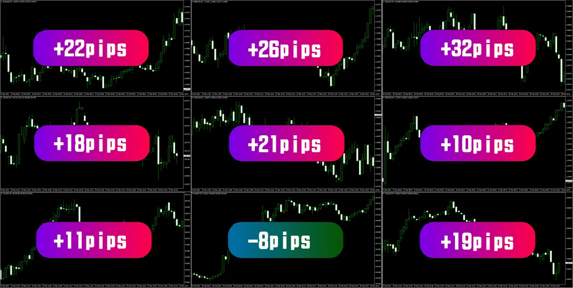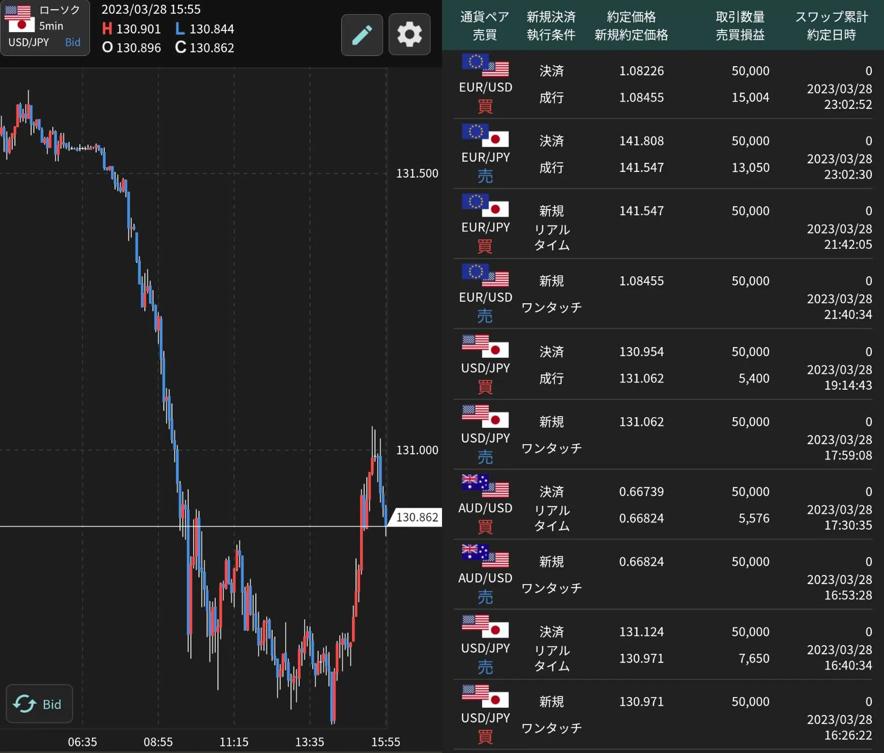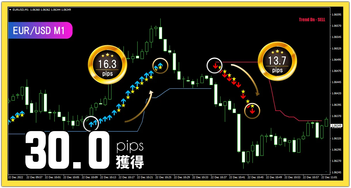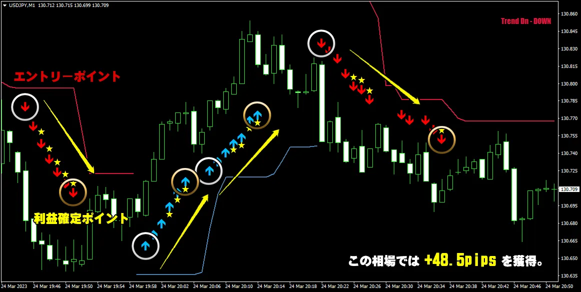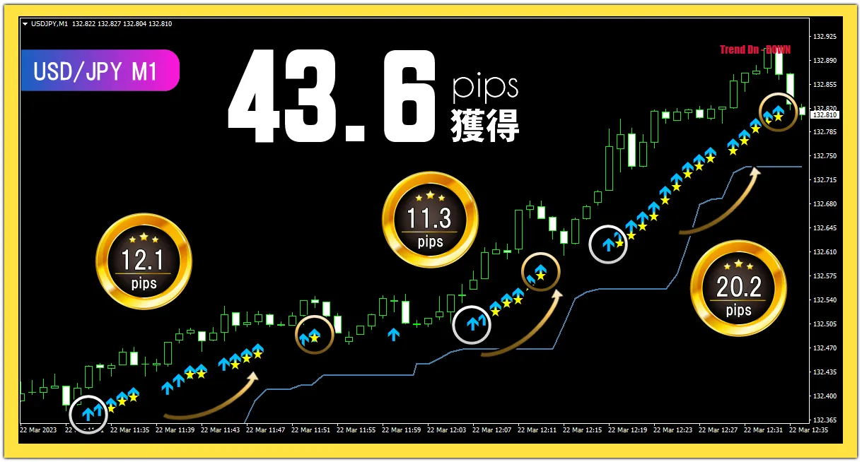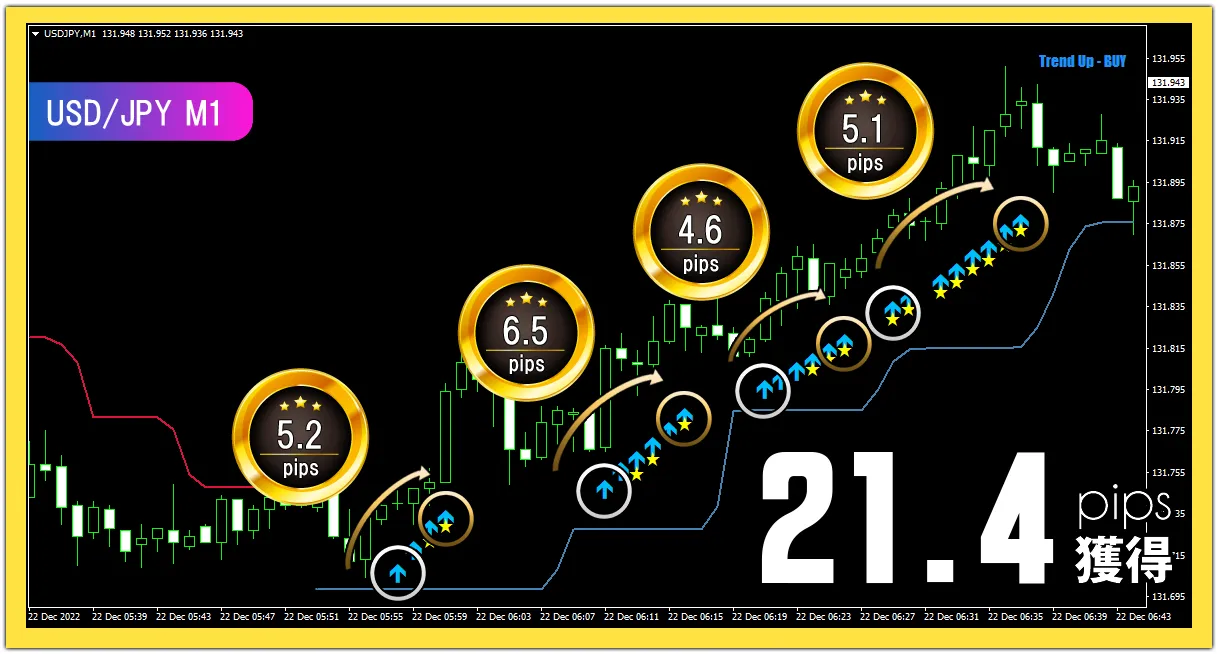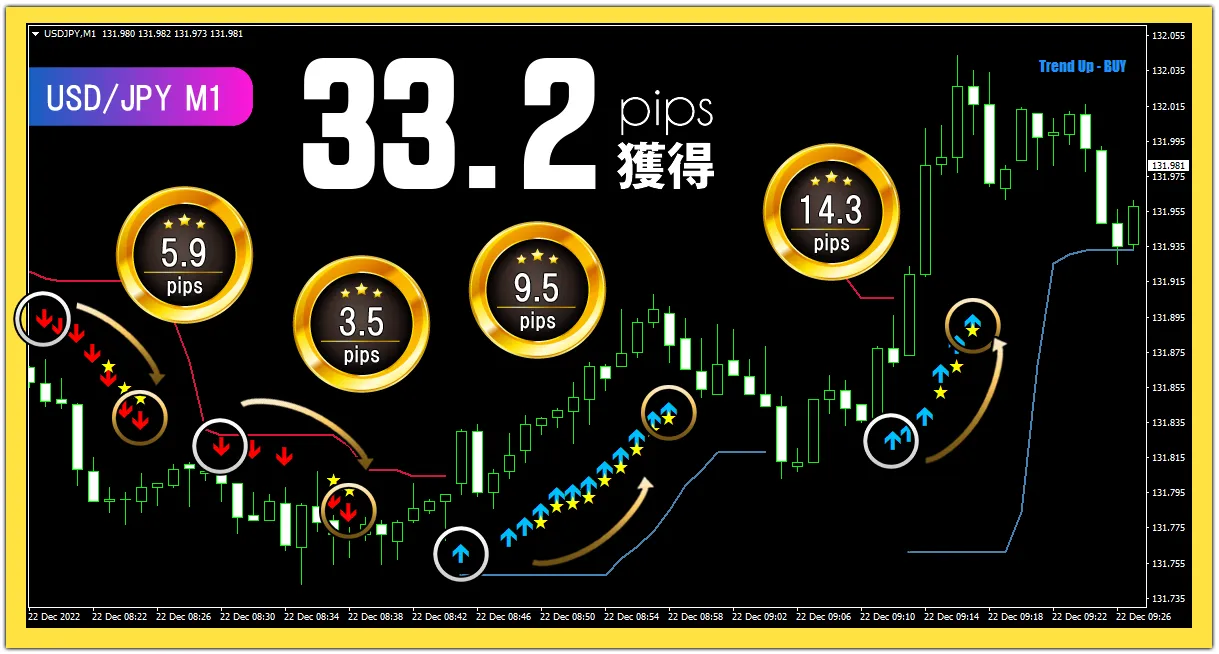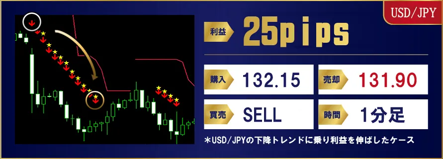 今回出品する「天空のFX」は長年に渡る検証作業を経て、ついにFXトレード手法の構築に成功した方法です。 その結果、新手法を駆使することにより、相場のランダムな値動きによるメンタル負荷から完全に解き放たれ、淡々とトレードを重ねられるようになりました。そのお陰で、ポジポジ病や薄利決済病の完治とともに、毎月末の口座残高も右肩上がりで増えていったのです。 私を負け組から勝ち組、そしてプロトレーダーにまで押し上げてくれたその新FX手法こそが、今回公開させていただいた「天空のFX」です。 シンプルかつ明解で実践しやすい「天空のFX」を駆使すれば、トレンドの初動をとらえた損益比率の高いトレードを、メンタル負荷なく淡々と遂行していけます。 従って、FX経験者のみならず、初心者の方でも、安心して取り組んでいただけます。 「天空のFX」が、物価高に起因する経済的苦境から抜け出す方を一人でも多く輩出できれば、それは手法開発者として望外の喜びです。 正しいトレードを一日も早くマスターして、安定して変えるトレーダーを目指してください! 「天空のFX」式ロジックを使うことで、 堅実な利益と勝率を目指してトレードすることが可能になります。 具体的な数字目標としては、1回に+10pips、+20pips程度を積み上げて、1日80pips程度を目指します。 このレベルは多くの方が目指せる数字ですし、 このロジックをご使用になる方には、ぜひ目指していただきたいレベルです。 最初は月利10%を目標でも構いません。運用を続けていけば、 毎月資産を倍にするペースでトレードをすることもできますし、その半分の収益分50%でも、 複利で運用すれば元手10万円が1年も経たずに大きく増える計算です。 もちろん毎日全てが上手くわけではないと思いますが、 安定したスピードで資産を増やすことが可能となります。 少ない資金からでも、堅実に富を増やしていきたい方は、 ぜひこの「天空のFX」を使ってトレードをしてください。 ここからは1日におけるトレードケースをご紹介します。 夕方からUSD/JPYは上位足でも大きなトレンドが継続していました。 その間に1分足のローソク足で一気に下がり出して↓サインツールが発生しました。 矢印サインツールはトレンドを捉えながらも大きくローソク足が動く場面や連続して続く場面で発生します。これによりトレンドの初動を捉えやすく、エントリーした際にプラス利益で進んでいくことが良くあります。 利益を伸ばしながらも終盤で、約25pipsの利確をしました。