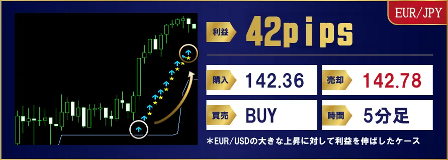 AUD/USDがレンジ相場気味に推移していました。このような相場では深追いせずに小さく勝って利益を積み上げる方法を維持します。 平均5pips程度の利確を狙ってトレードをします。 エントリーは素早く、利確や損切りも早めに行いながら、何度もエントリーチャンスを拾っていきます。 EUR/JPYの5分足です。メインチャートでは水色の線が表示されており、現在の相場が上昇or下降かを正確に分析します。 この方向性を参考に、矢印サインツールが発生すれば買いでエントリーをします。結果的に大きく上昇したため、ポジションを保有しながら利確幅を伸ばしました。 Q. お勧めの通貨はありますか?  ドルストレートなどメジャーな通貨ペアをお勧めします。 USD/JPYやEUR/USD、AUD/USD、EUR/JPYなどは特にお勧めです。 Q. トレード回数は1時間に何回程度ありますか? A. 為替相場の動きや活発な時は1時間に数回~5回程度あります。 Q. 使用する時間足は何ですか? A. 1分や5分足を主に、15分足や60分足でもトレード可能です。 Q. アラート機能はありますか? A. アラートは搭載されており、ONとOFFができます。 Q. このトレード手法やインジケーターは長年使えますか? A. 為替相場は年々変化してくものですが、短期的には動きはトレンド相場やレンジ相場を繰り返しながら、穏やかに進んでいくものです。 そのため、長く使っていただけるように設計しています。 私自身は4年間この手法で頑張っていますので、共にトレードして頂けたらと願います。 最後までお読みいただきありがとうございました。 FXで勝つにはエントリーはだけでなく、決済(利確や損切り)が大切です。これらを総合的にロジックに組み合わせて最も安定したトレード手法になりました。 「天空のFX」は私自身が長年に渡って積み上げてきた実績のあるトレード手法です。 FXは安定したトレード手法を確立して続ければ、資金も増えていく優れた投資ですので、しっかりと身に付けて欲しいと思います。私自身が投資手法を公開したのには、多くの人がFXで利益を継続して勝ち続けて欲しいと思った故です。 そのため、私の投資手法やシステムを提供できればと思いました。多くの方にお使い頂き結果が出れば幸いです。ありがとうございました。
