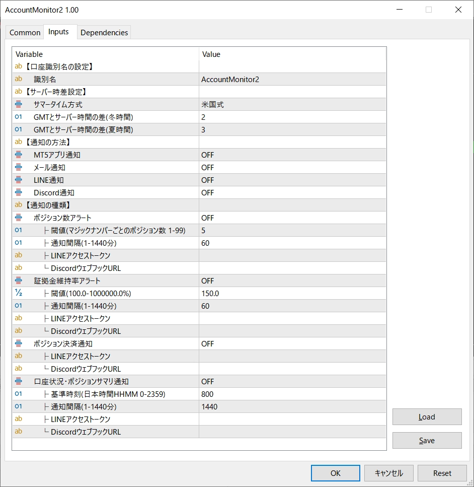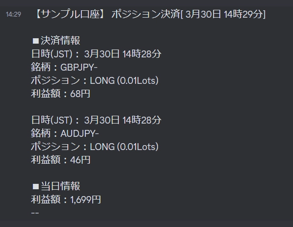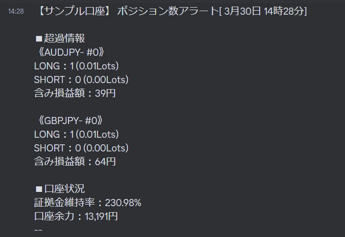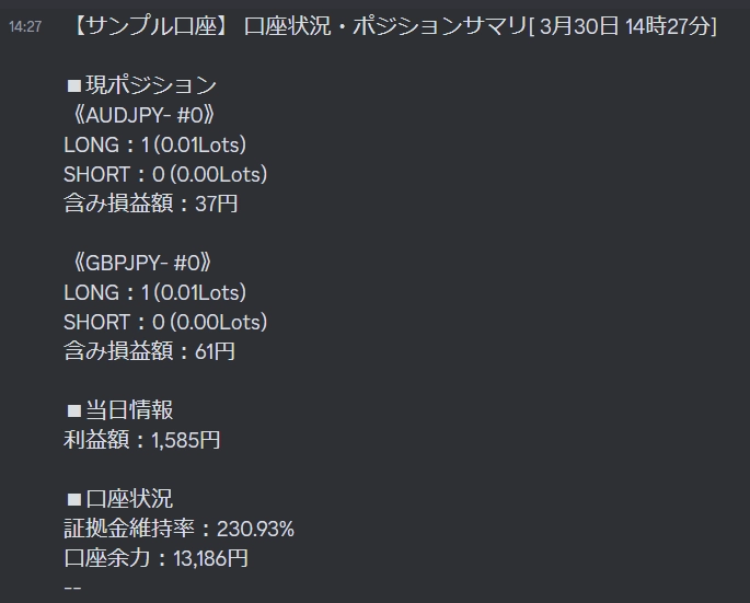 MT4/MT5口座に存在するポジションを、マジックナンバー、取引通貨ごとにまとめ、「口座状況・ポジションサマリ」として通知します。