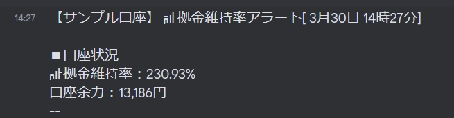 MT4/MT5口座の証拠金維持率が「閾値」パラメータで指定した値に到達した場合「証拠金維持率アラート」を通知します。通知後は「通知間隔」パラメータで指定した間隔で再チェックを行い、閾値に到達し続けている間は通知を継続します。