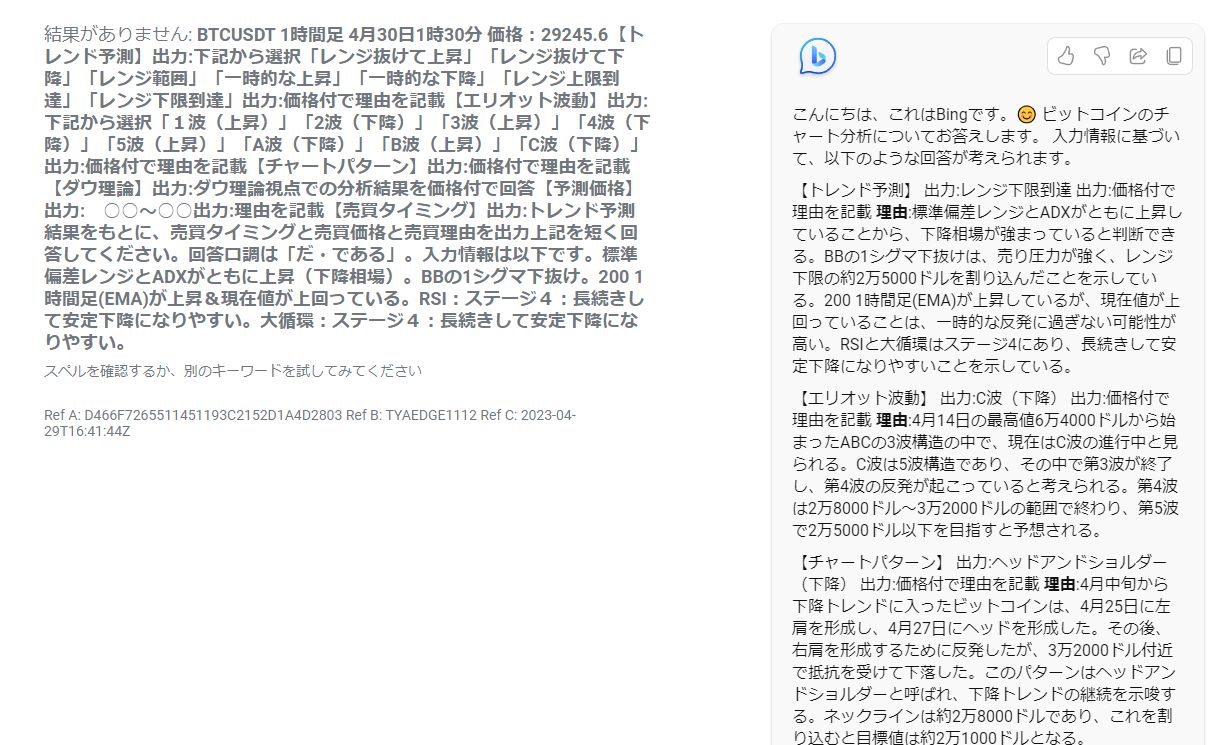BTCUSDT 1時間足 4月30日1:30 価格:29245.6 [トレンド予測] 出力:「レンジ外上昇」「レンジ外下落」「レンジ幅」「一時的上昇」「一時的下落」「レンジ上限到達」「レンジ下限到達」から選択 出力:価格で理由付け [エリオット波動]。出力します:以下から選択 "1波(上昇)" "2波(下降)" "3波(上昇)" "4波(下降)" "5波(上昇)" "A波(下降)" "B波(上昇)" "C波(下降)"出力:チャートパターン】の価格を理由とする。出力:ダウ理論】の根拠を価格で示す。アウトプットダウ理論の観点からの結果を分析する:XX-XX 出力:取引タイミング】出力:取引タイミング、取引価格、取引理由を出力:トレンド予測結果に基づき、売買タイミング、売買価格、売買理由を出力 上記を短文でご回答ください。回答は「だ・だ・だ」調でお願いします。入力情報は以下の通りです。標準偏差レンジ、ADXともに上昇中(下げ相場)。200の1時間足(EMA)は上昇中&現在値は上。RSI:ステージ4:長続きしており、下値が安定しそう。一般的な円相場:ステージ4:長続きし、下値が安定しやすい。