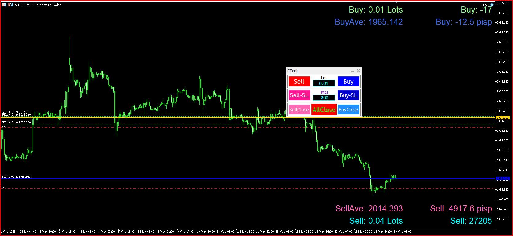 ShowAveragePPで売り平均・買い平均両方の情報が視覚的に理解し易くなり、EToolで売り/買いポジション別々の管理が出来ますので
