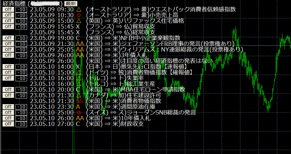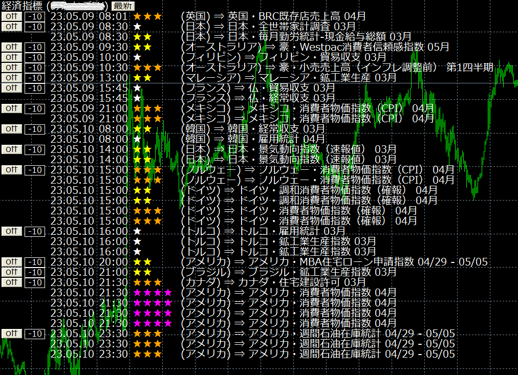 経済指標の更新ボタンを押すと、最新の経済指標が表示されます。当日と翌日の2日分が表示されます。