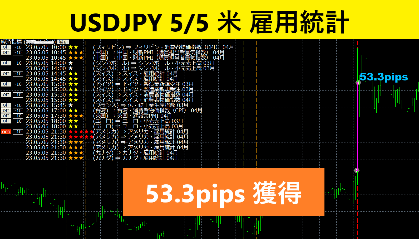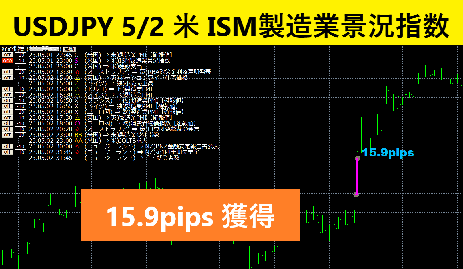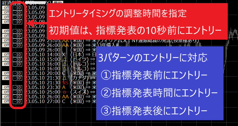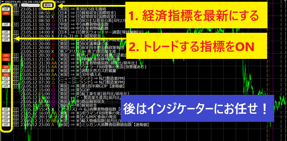 2.トレードを行う指標をON ONにした指標の時間になったらトレードを行います。