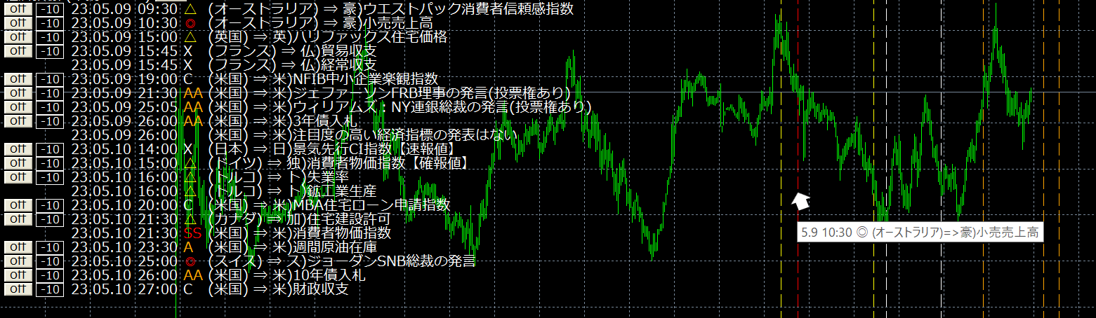 経済指標は重要度に応じて色分けされた垂直ラインが表示され、指標発表のタイミングが確認できます。 また、垂直ラインにカーソルを合わせることで経済指標が確認できます。