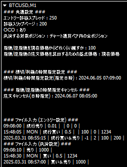 • エントリー(成行/指値/逆指値)や決済の時間指定方法は、大きく「パラメータ入力」と「ファイル入力」があります。前者は簡単に時間を指定できる一方、後者は細かい指定や複数の時間を登録することが可能です。
