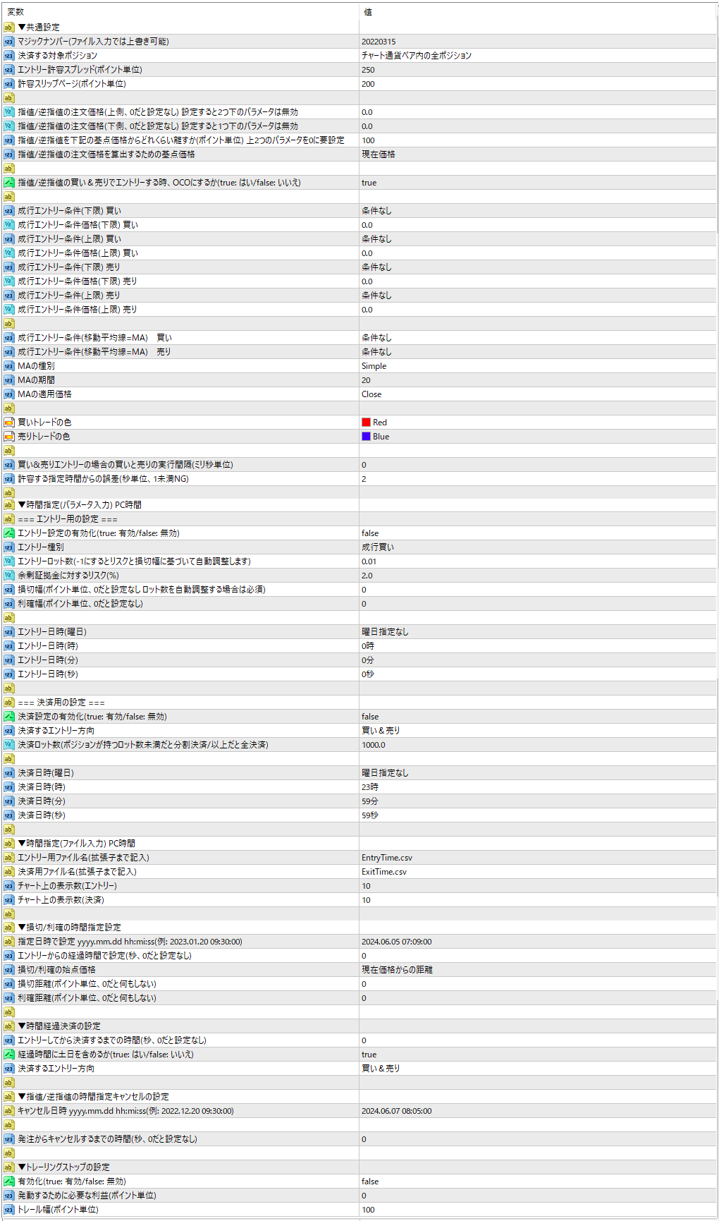 • 決済は買いポジションだけか売りポジションだけか、またはその両方を決済するかを選択できます。さらに、特定のマジックナンバーに限定したり、チャート通貨ペアなのか全通貨ペアを対象にするのかを選択できます。またファイル入力の場合は分割決済もできます