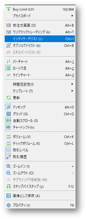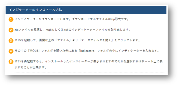 MT5ファイルメニューからデータフォルダを開き、MQL5フォルダの中に「indicators」というフォルダがあるのでそこにダウンロードしたファイルをコピーします。 MT5を再起動した後、挿入→インディケータ→カスタムでダウンロードしたインディケータを選ぶとチャートに反映されます。