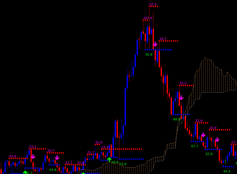 上昇時…下ヒゲ矢印が出てから上ヒゲ矢印の連続 下降時…上ヒゲ矢印が出てから下ヒゲ矢印の連続 転換時…1本のローソク足に上ヒゲ矢印と下ヒゲ矢印、天井や大底で矢印の頻発