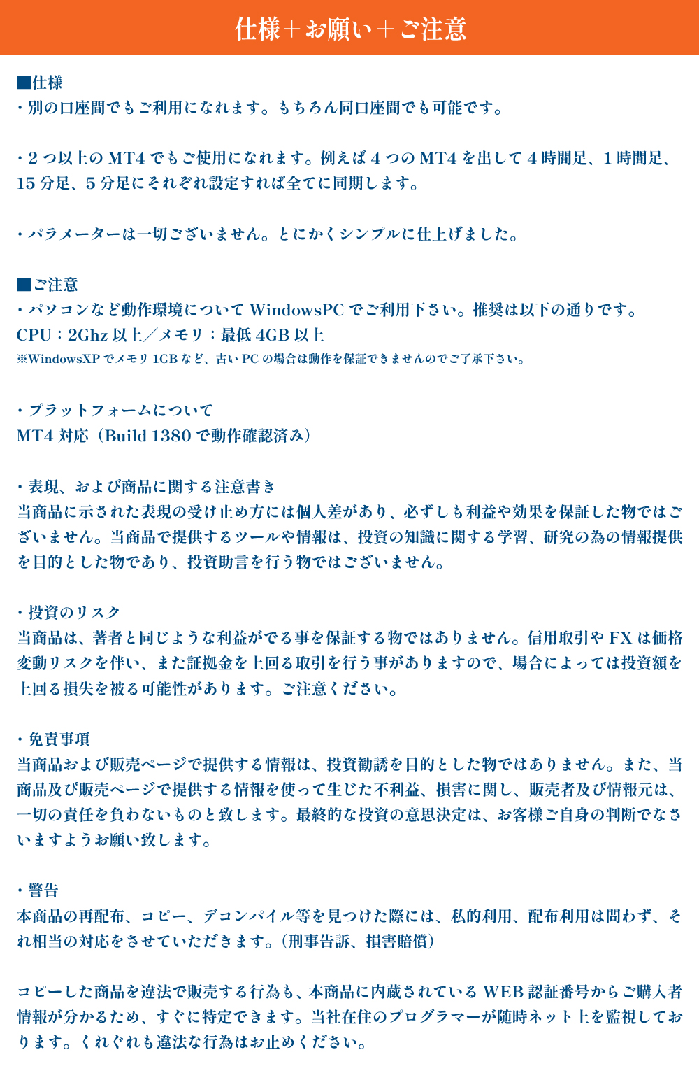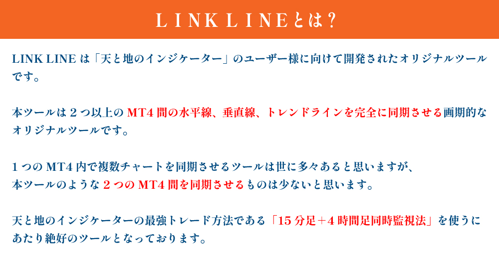 天と地のインジケーターの最強トレード方法である「15分足+4時間足同時監視法」を効率的に使用するために作成されたインジケーターです。2台のMT4の水平線、垂直線、トレンドラインを完全にリンクさせます。