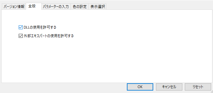 A:こちらの商品にはWeb認証がありますので、インジケーターをチャート上に入れていただき、下記画像の『DLLの使用を許可する』にチェックを入れてください。そうするとチャート上に反映されます。