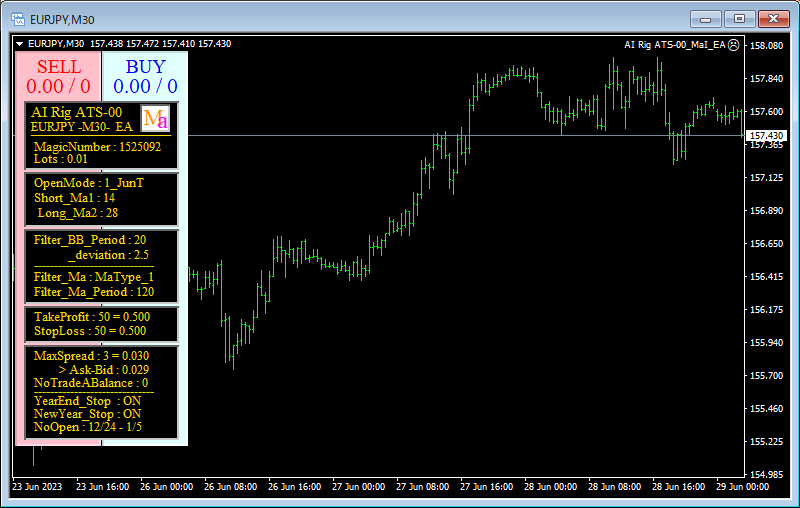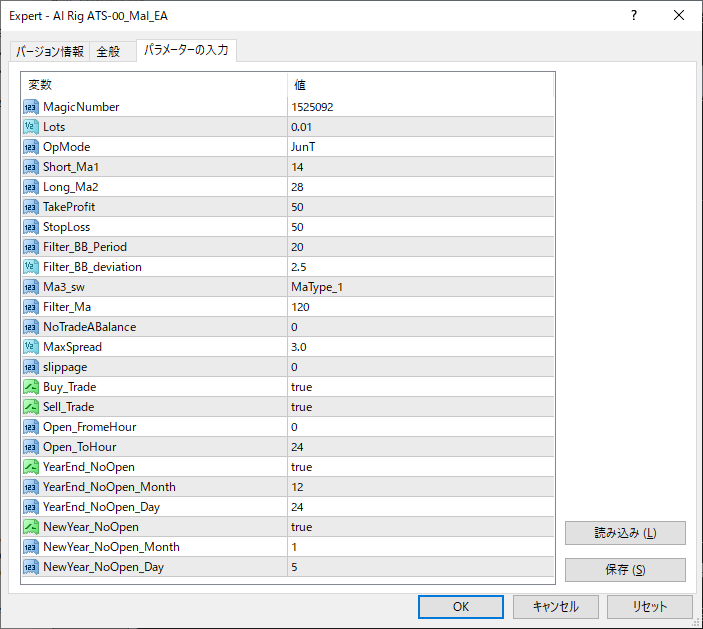 トレードを行う設定値を決めたらいよいよトレード開始です! パラメータに取引ロットを設定し、選んだ設定値をセットすれば準備完了。 デフォルトでは両建てですが、Buy、Sellのどちらかに制限をかけて単一方向のみのトレードにも対応しています。これについてはパラメータの「Buy_Trade」、「Sell_Trade」で設定できます。スワップ効率の良いポジションのみのでレードを行いたいというトレーダーにもこれで万全です。 また、激しい値動きなどでスプレッドが拡大したときに取得を行わせない安全装置も装備しています。 その他、年末年始の取引制限も備わり、機能も充実です。 設定した情報はチャート上に表示されますので、プロパティを開かなくても確認でき、とても便利です。 |