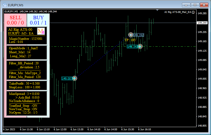 | パネル内の最上部には保有中のロット数とポジション数が表示されます。画像Buy部の「0.01/1」は「保有ロット数/保有ポジション数」です。 チャート上にはポジションを取得すれば「取得価格」、決済されたときには「決済価格」と「獲得ポイント」を表示します。 この場合は、「149.007」で取得し、「149.192」で決済、そして「185ポイント (=18.5銭)」を獲得したことを表しています。 そして更に「149.143」で取得をし、ポジション保有中です。 | |