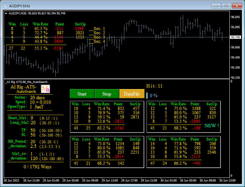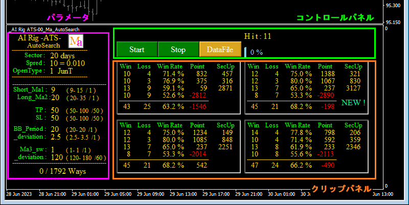 | パラメータで指定した条件をクリアした優良なデータだけを表示していきます。最大4パターンまで表示でき、好データが見つかる度に古いもは消え新しいものに上書きされていきます。 ※データベース上には優良データはすべてファイルに保存されています。上書きされて消えてしまうことはありませんのでご安心ください。 | |