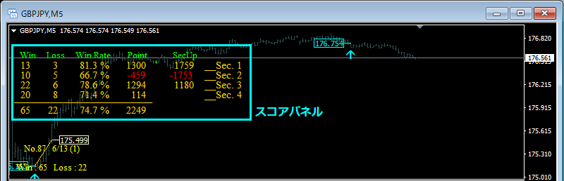 セクタごとの、勝ち数、負け数、勝率、獲得ポイント(Pips)などと合計値をスコア形式で表示します。 |