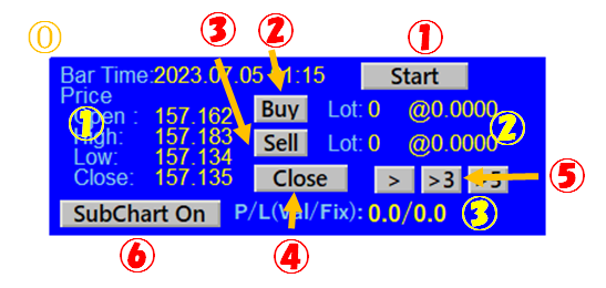 ◆表示情報(画像の番号を参照) ⓪操作パネル:各情報とボタンの表示およびドラッグアンドドロップすることで表示位置を変更 ①練習トレードの基準となるBar(チャート右端)の日時とその4本値を表示 ②ポジション数とその平均単価を表示 ③現在ポジションの評価損益と開始(Start)してからの確定損益をPips単位で表示
