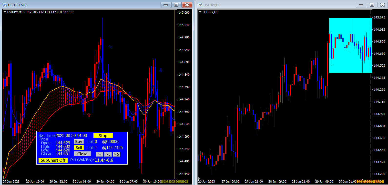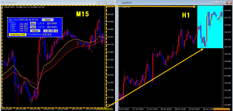 <画面例:ツール適用チャート(15分足)とサブチャート(1時間足)>