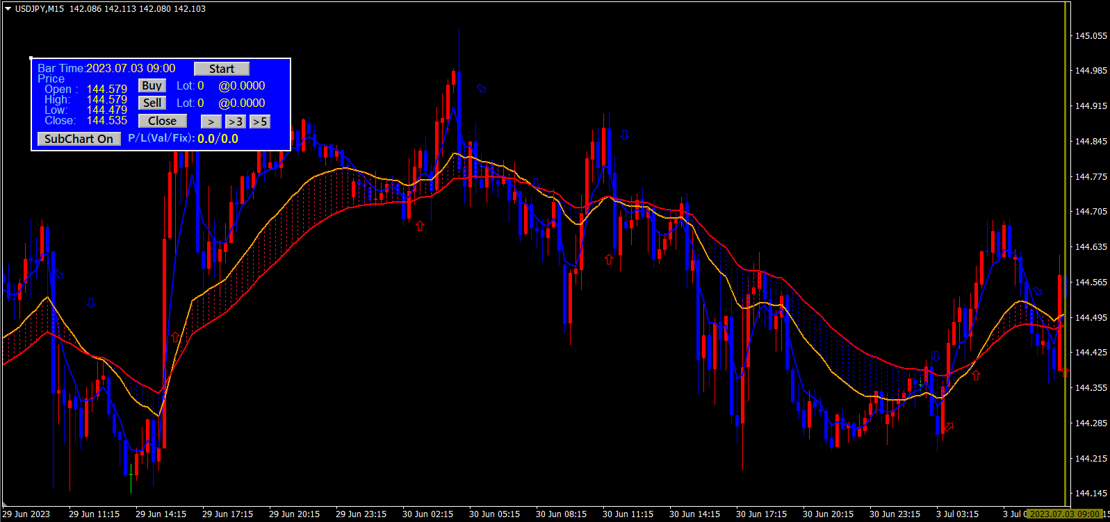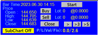 (※)ボタンをクリックするごとにスクロールボタンは1Bar、3Barか 5Bar、Buy/Sell/Closeボタンは1Bar右に移動します。