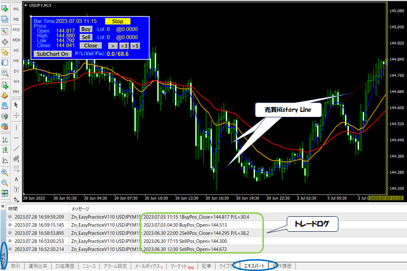 【2023/7/28版(Ver.1.10)改訂機能】 ・パラメータ指示により仕掛/手仕舞(Open,Close)の位置記号と取引履歴Line表示が可能 ・パラメータ指示により各ボタン(売・買Open,Close)操作での状況(Log:Bar日時、操作内容、価格、損益Pips)表示が可能 *Log表示場所:ターミナルのエキスパートタブに表示 (以下画像を参照願います) ・PGコード整理並びに軽微なBug修正