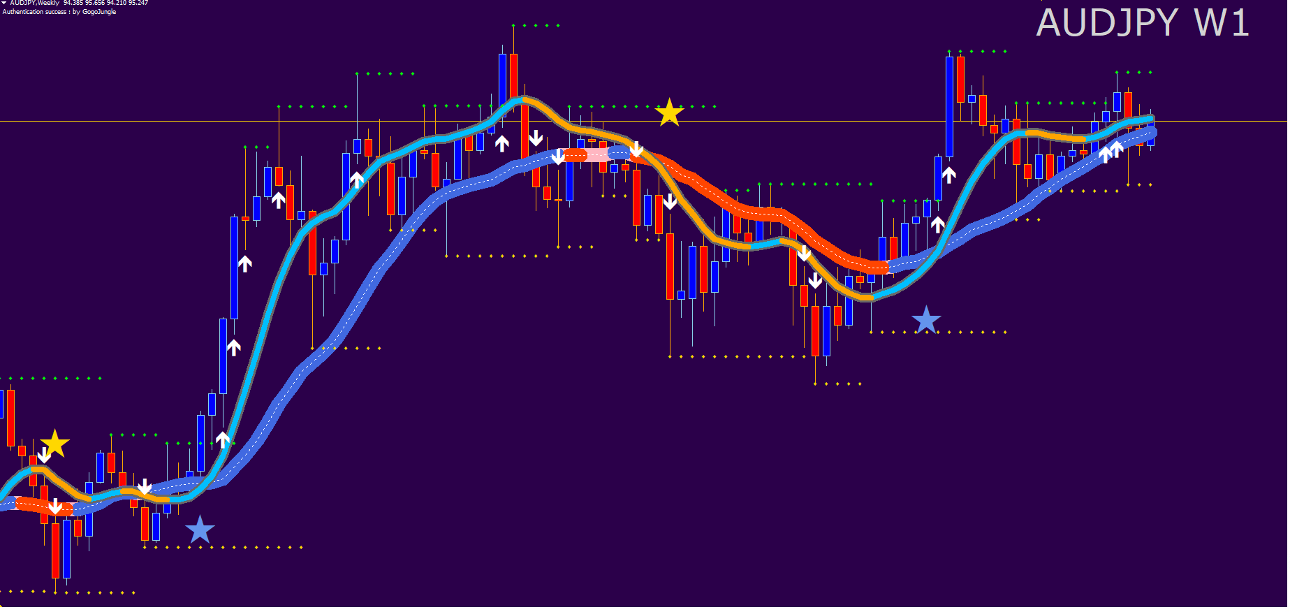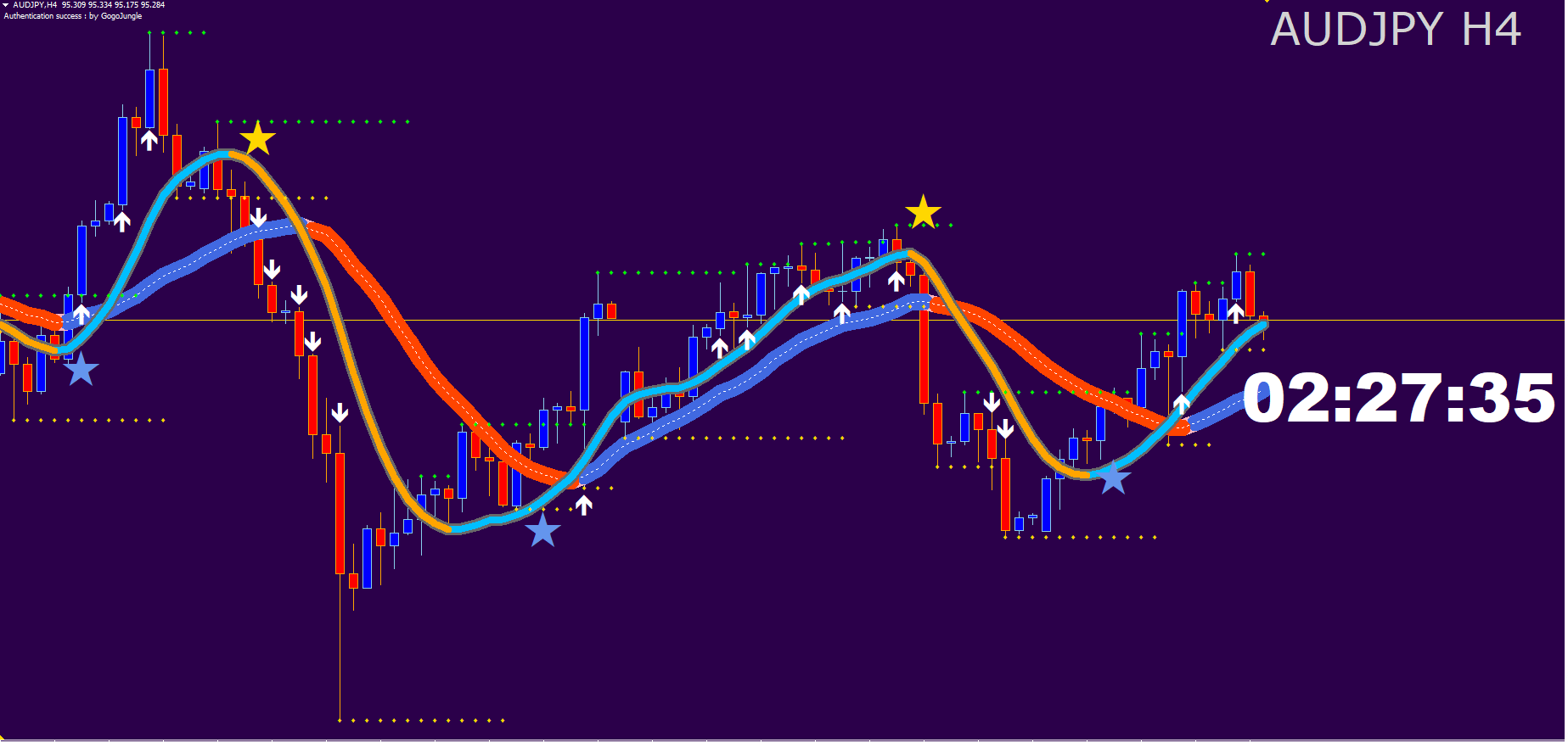 ※ Web認証ツールにつきましては、正常に認証されますと、チャート左上およびMT4下部[ターミナル]内の[エキスパート]タブに「Authentication success:by GogoJungle」と表示されます。
