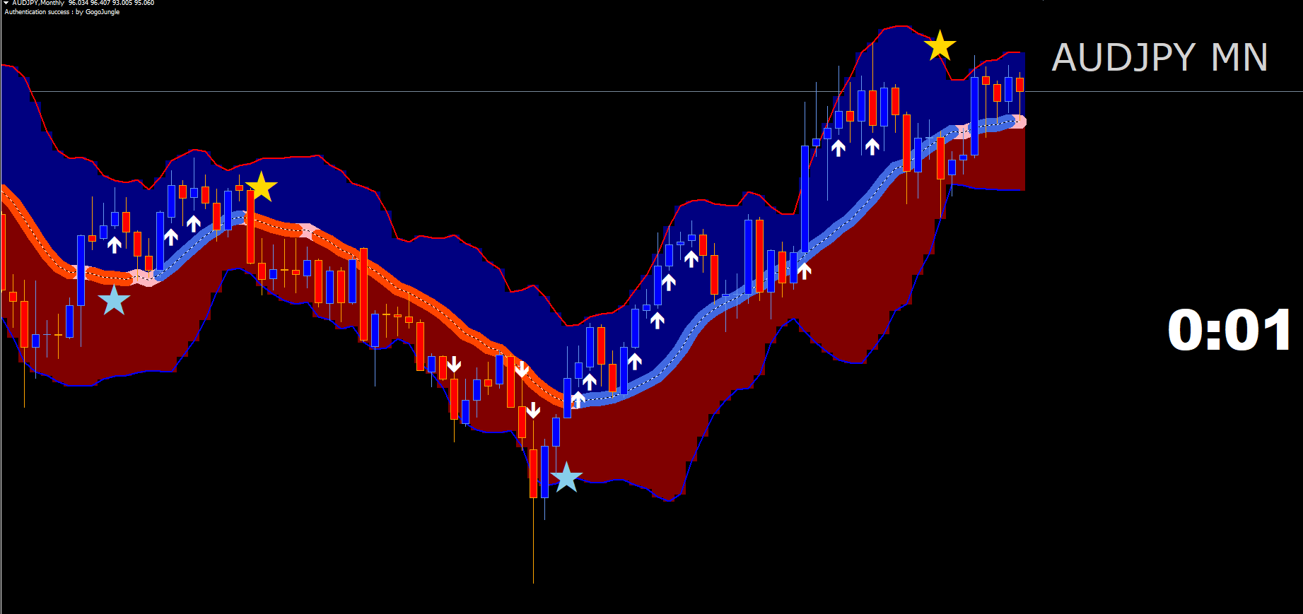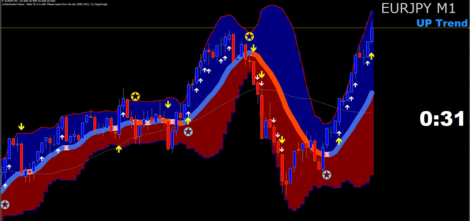 ☟ ボリンジャーバンドバージョンも引き続き付いています。★のサインは、パラメータで矢印サインにも変更できます。